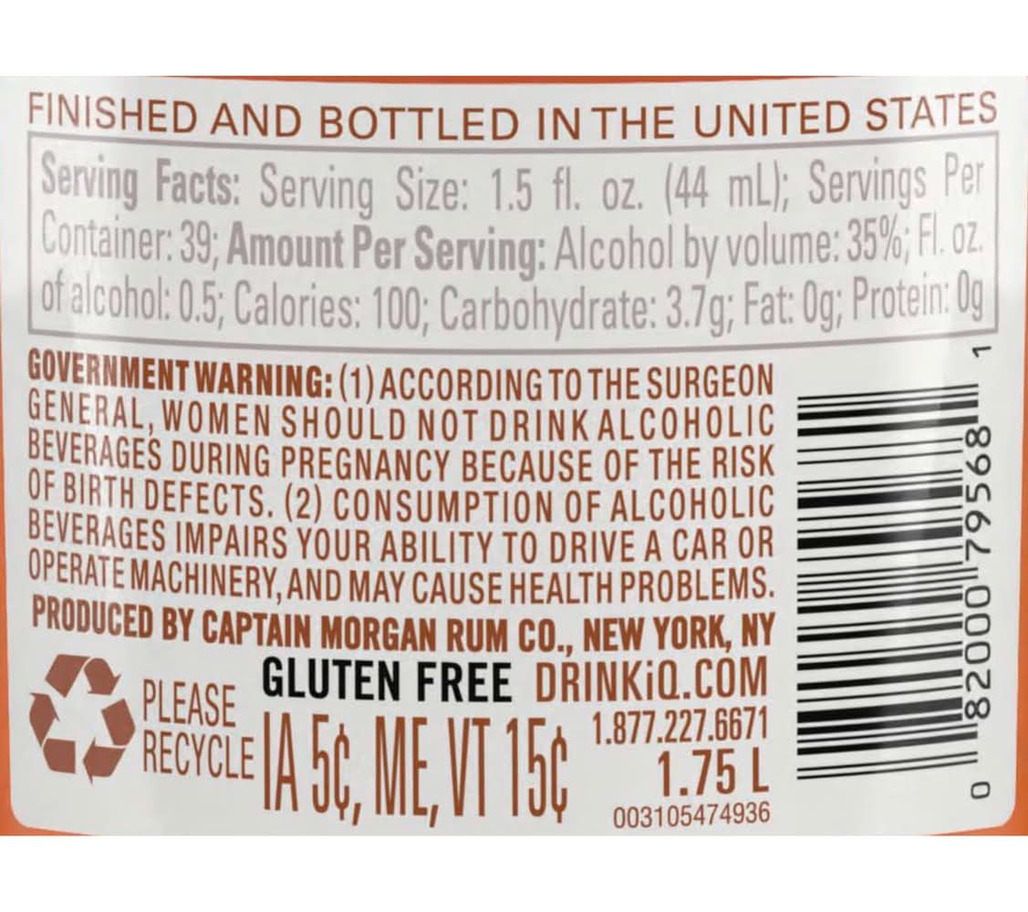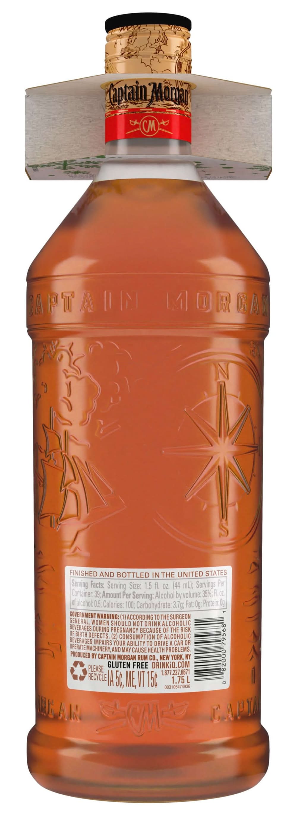 Spice it up with our classic Captain Morgan Original Spiced Rum, packaged with a mini bottle of Captain Morgan Sliced Apple. Our original spiced rum is a secret blend with subtle notes of vanilla and caramel to create a smooth and medium-bodied taste. With less than 1 gram of sugar* and only 86 calories per serve,* Captain Morgan Original Spiced Rum is gluten-free and perfect for pairing with your favorite mixers. There's a reason this is the #1 selling spiced rum in North America! Perfect for a long island iced tea cocktail. Includes one 70 proof 1.75 L PET bottle of Captain Morgan Original Spiced Rum and one 70 proof 50 mL bottle of Captain Morgan Sliced Apple. Drink responsibly, Captain’s Orders! *Per 1.5 oz. serving- Average Analysis: Calories 86, Carbohydrates .5g, Fat 0g, Protein 0g Alcohol by volume: 35%
