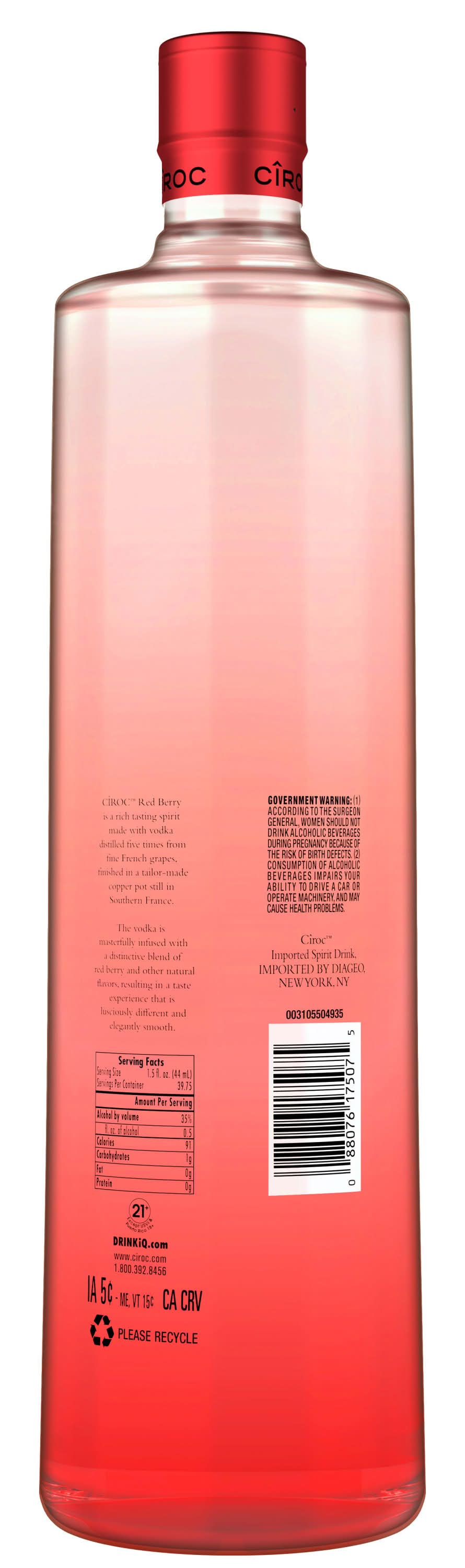 CIROC Red Berry is a rich tasting spirit made with vodka distilled five times from fine French grapes, finished in a tailor-made copper pot still in Southern France. This spirit is masterfully infused with a distinctive blend of raspberry, strawberry and other natural flavors, resulting in a taste experience that is lusciously different and elegantly smooth. Perfect for any vodka soda. Includes one 70 proof 1.75 L bottle of CIROC Red Berry. Please drink responsibly. Alcohol by volume: 35%