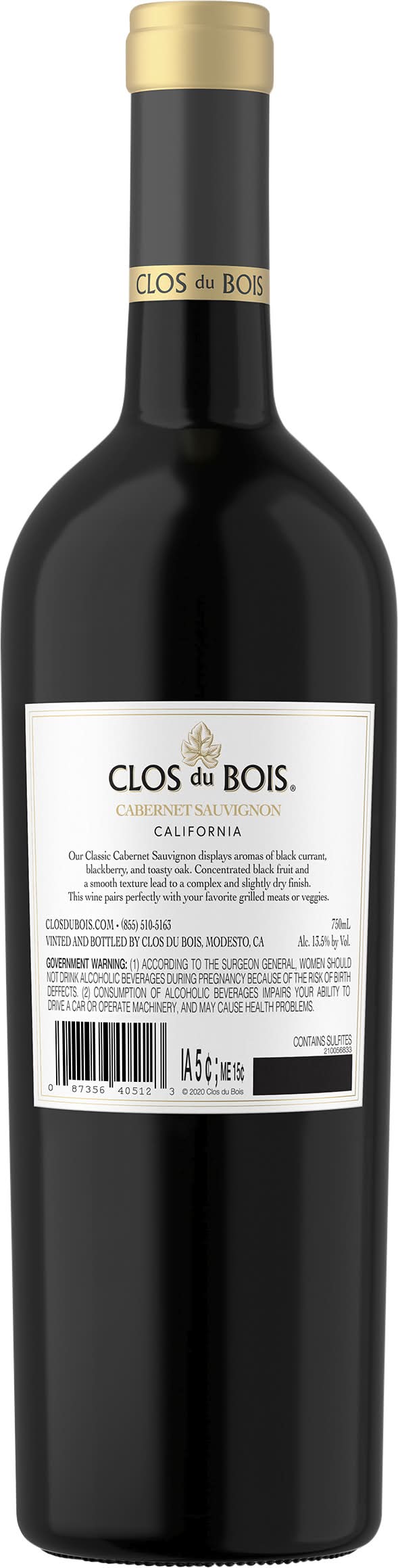 Hand-selected lots. Our Classic Cabernet Sauvignon displays aromas of black currant, blackberry, and toasty oak. Concentrated black fruit and a smooth texture lead to a complex and slightly dry finish. • Alcohol by volume: 13.5% • Clos Du Bois, Modesto CA