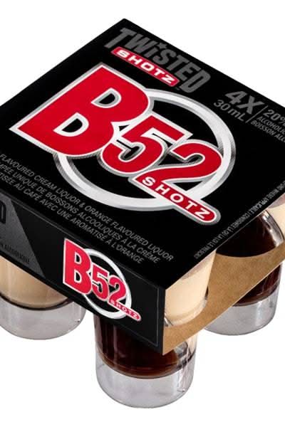 Twisted Shotz B52 is a packaged set of four 30 ml shots, each containing a blend of coffee-flavored and orange-flavored liqueurs. • Pack size: 4 • Alcohol by volume: 20%