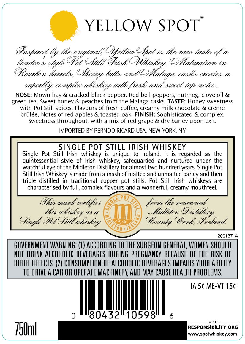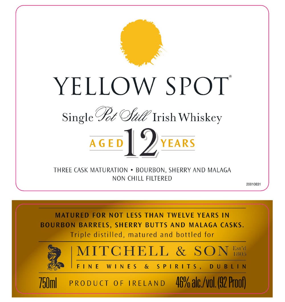Yellow Spot contains whiskey matured for a full 12 year period in three oak cask types: American bourbon barrels, Spanish sherry butts, and uniquely, Spanish Malaga casks. Alcohol by volume: 46%