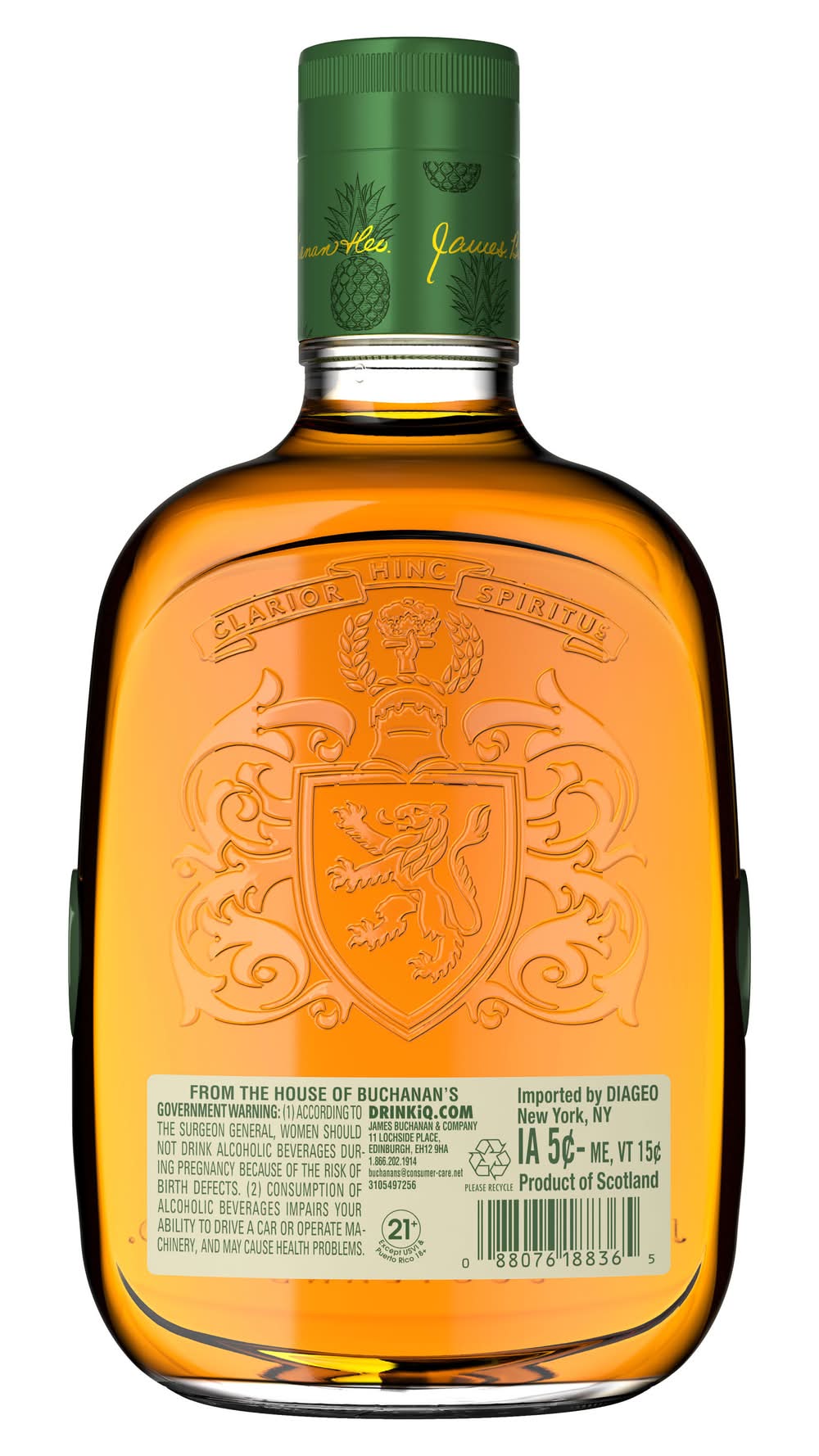 Distilled in Scotland. Customers are encouraged to recycle the bottle after enjoyment. • Flavor: Pineapple • Alcohol by volume: 35% • Packaging: Reusable