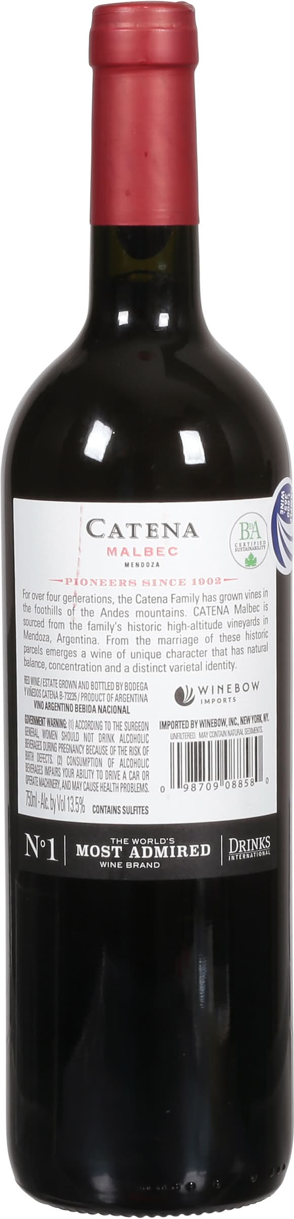 Since 1902: For over four generations, the Family has grown vines in the foothills of the Andes mountains. is sourced from the family's historic high-altitude vineyard. From the marriage of these historic parcels emerges a wine of unique character that has natural balance, concentration and a distinct varietal identity. Unfiltered. • Alcohol by volume: 13.5% • 2019 • Winebow, Inc., New York,ny.