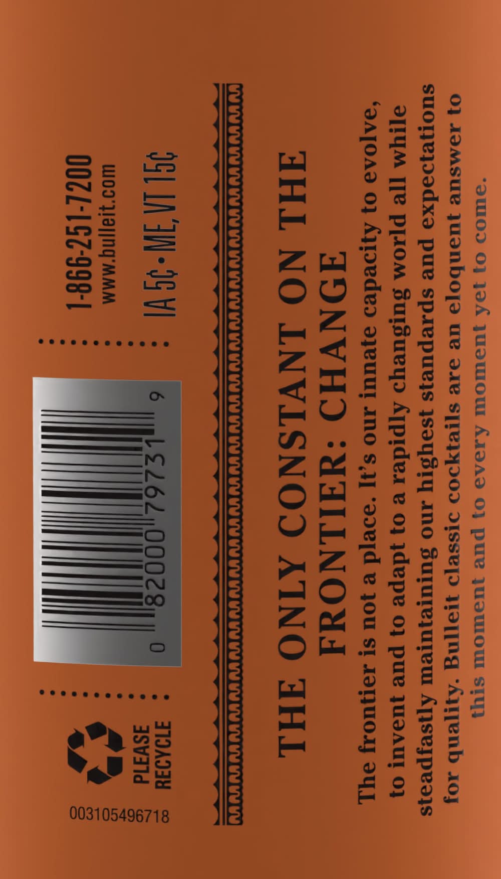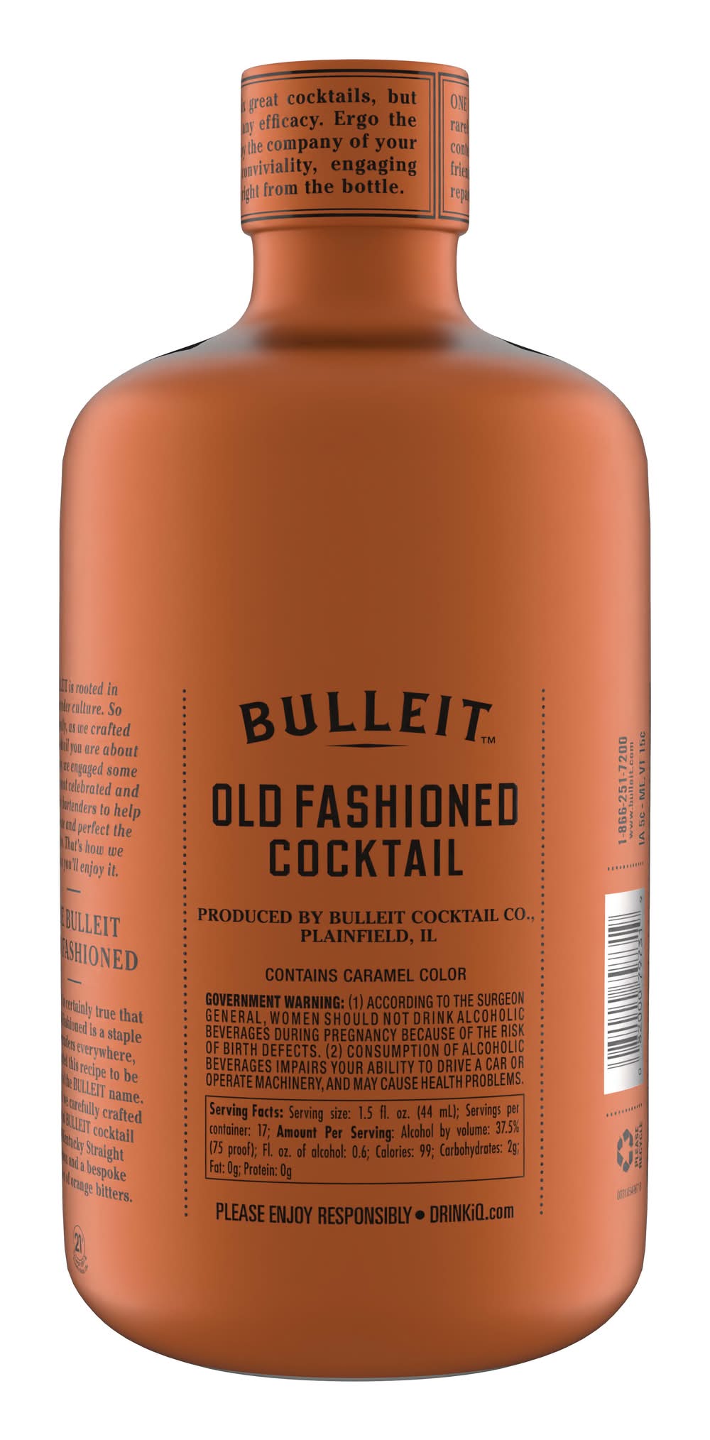 Must be 21+ to purchase. Best enjoyed straight up or over ice. One can be a Greater Host or one can mix great cocktails, but rarely can one do both simultaneously with any, Ergo the contents of this bottle, which allow you to enjoy the company of your friends while they enjoy your Hospitality, conviviality, engaging repartee, and a premium cocktail experience right from the bottle. Please enjoy responsibly. The Only Constant on the Frontier: Change the frontier is not a place. It's our innate capacity to evolve, to invent and to adapt to a rapidly changing world all while steadfastly maintaining our highest standards and expectations for quality. Bulleit classic cocktails are an eloquent answer to this moment and to every moment yet to come. This perfectly crafted cocktail is ready to enjoy. Feel free to serve neat, chilled or over ice. Should you decide to garnish, you will have to grapple with the age old debate: Lemon twist, orange twist or cherries Choose whatever you want. you're the bartender now. Bullet is rooted in bartender culture. So naturally, as we crafted the cocktail you are about to enjoy, we engaged some of the most celebrated and creative bartenders to help us refine and perfect the recipe. That's how we know you'll enjoy it. While it is certainly true that the Old Fashioned is a staple of bartenders everywhere, we wanted this recipe to be worthy of the Bullet name. As such, we carefully crafted a special Bullet cocktail with Kentucky straight bourbon and a bespoke mixture of orange bitters. • Alcohol by volume: 37.5% • Packaging: Reusable