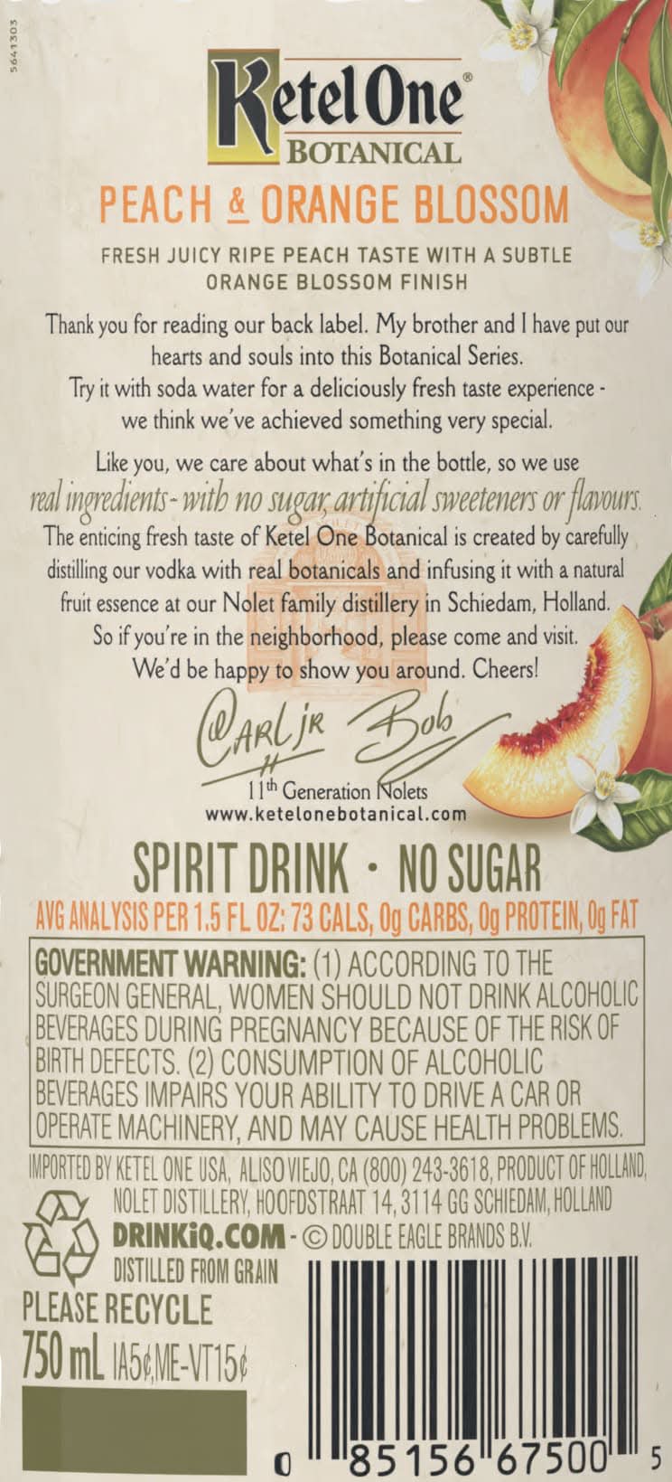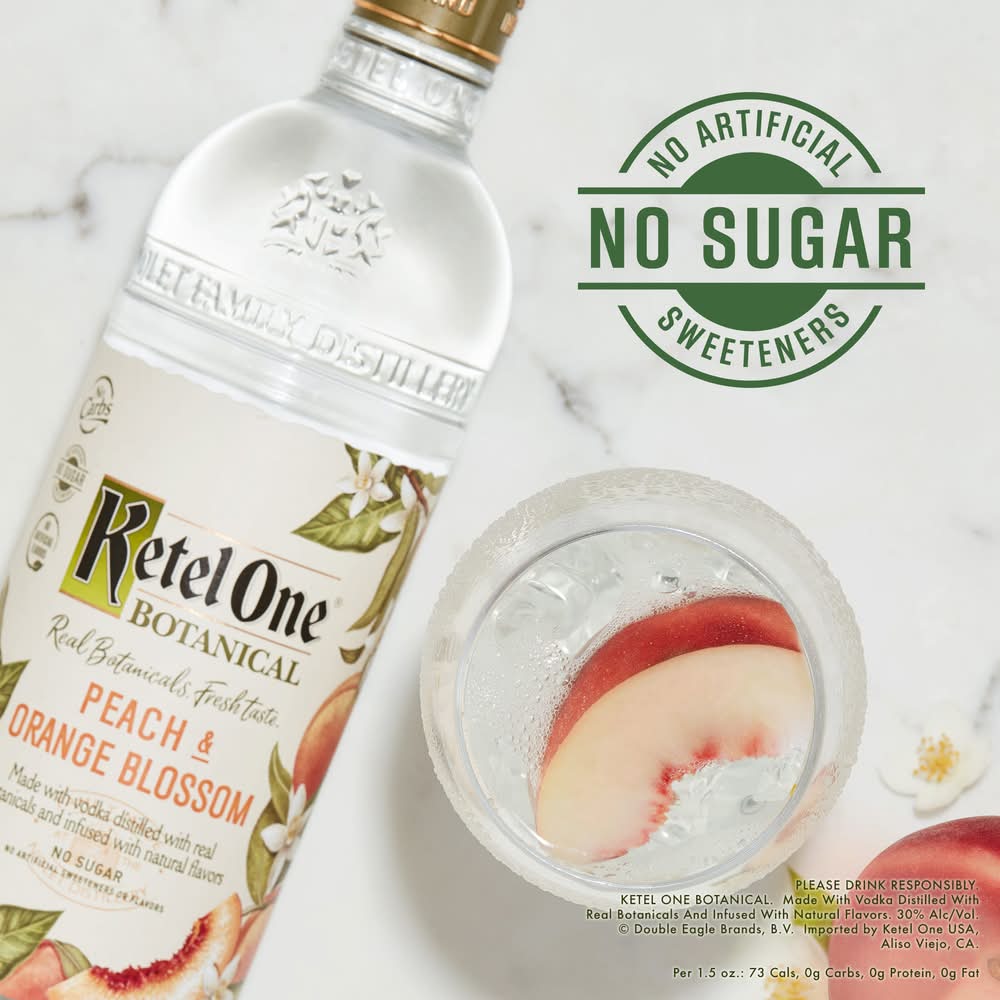 Ketel One Botanical Peach & Orange Blossom appeals to those who enjoy lush, juicy white peaches and bold notes of fragrant orange blossoms. Each botanical essence is individually and naturally obtained through innovative extraction methods and distillation processes for the freshest, cleanest, most crisp taste possible. With no carbs, artificial flavors, sweeteners or sugar, our vodka is the mindful way to celebrate the weekend or relax with friends. Perfect for any vodka soda. I Please drink responsibly. • Flavor: Peach-orange blossom • Alcohol by volume: 30% • Packaging: Reusable