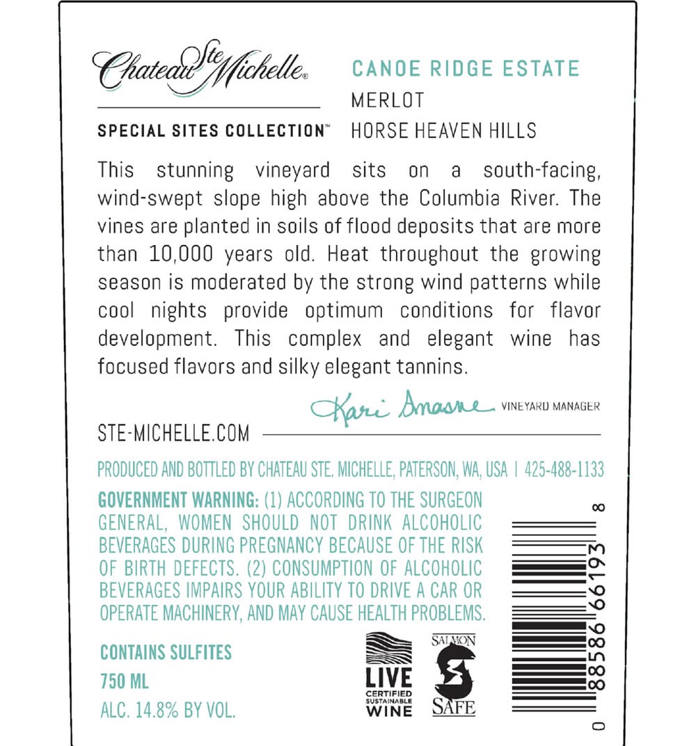 Chateau Ste. Michelle Canoe Ridge Estate Merlot consistently exhibits elegance, concentration, and fine tannins. This Merlot red wine exhibits dark cherry fruit, with an opulent mouthfeel and structure. The medium-full bodied Chateau Ste. Michelle Canoe Ridge Estate Merlot pairs beautifully with Italian dishes and spicy rice dishes like jambalaya, or enjoy a glass of wine on its own. For optimal flavor, Merlot red wine is best served slightly cooler than room temperature, at around 60 degrees. A bottle of this Merlot red wine is 750 mL and has 14.5% ABV. Since 1967, the dedicated winemakers at Chateau Ste. Michelle have transformed the finest grapes into some of the most spectacular wines in the world. At Chateau Ste. Michelle, the experience of Washington State’s inviting elegance and sophistication is in everything we do. Championing craftsmanship and creativity to provide a sense of wonder in every bottle. Chateau Ste. Michelle winery owns 3,500 acres in the Columbia Valley of eastern Washington, including Horse Heaven, Canoe Ridge Estate and Cold Creek vineyards. 2009