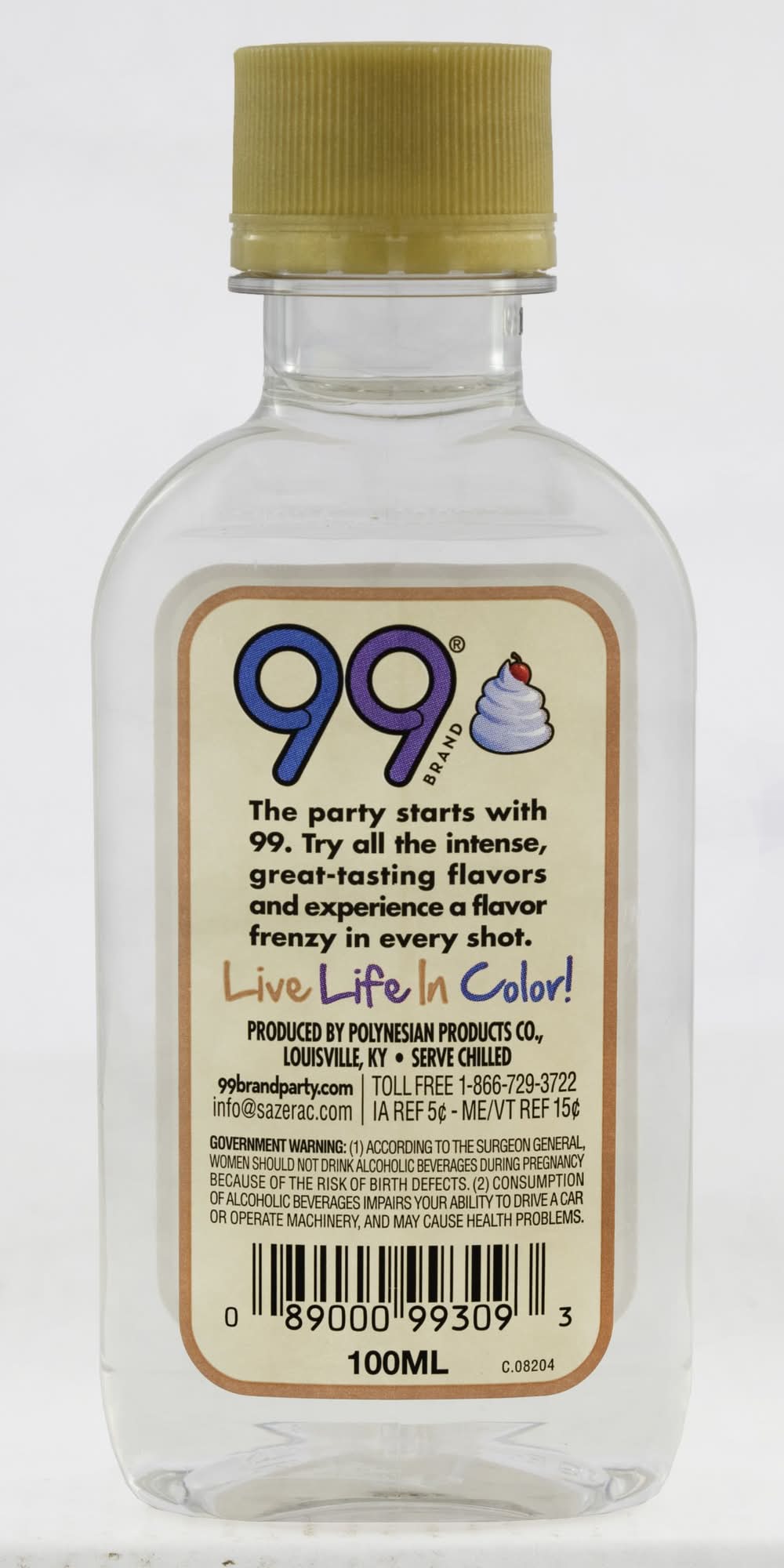 Liven up your experience with the exciting flavor of 99 Brand Whipped Liqueur. At 49.5% alcohol, 99 Brand drinks can be enjoyed out of the bottle for a burst of tasty whipped cream flavor. Perfect for any party or celebration with friends, these liqueur shots can be used in a multitude of alcoholic beverages and mixed drinks. Live life in color with 99 Brand Liqueur. Please drink responsibly. • Alcohol by volume: 49.5% • Sazerac, Louisville, KY • Packaging: Reusable