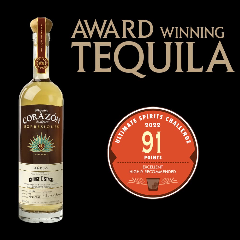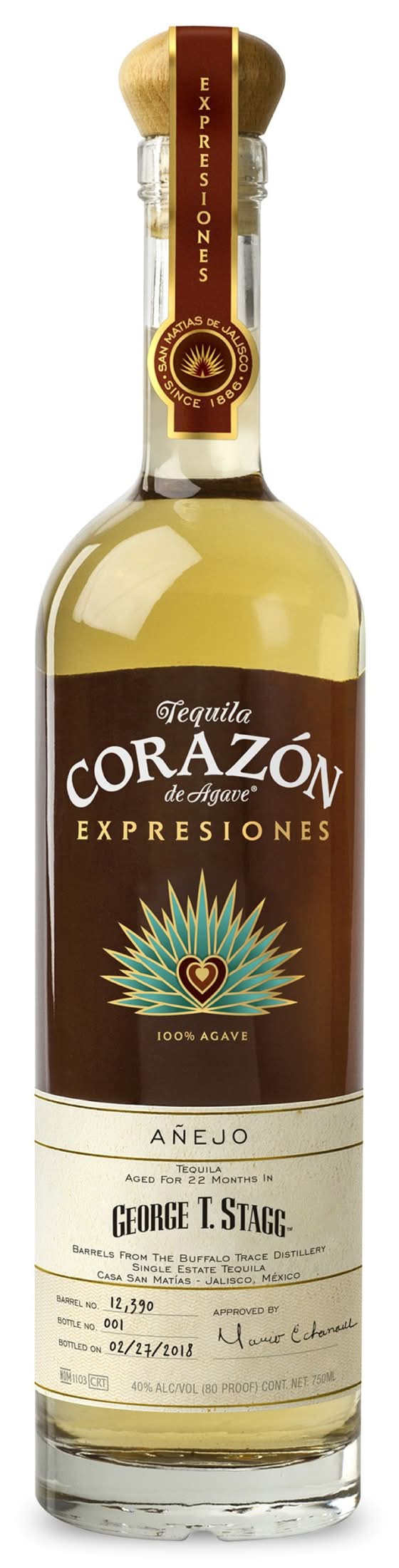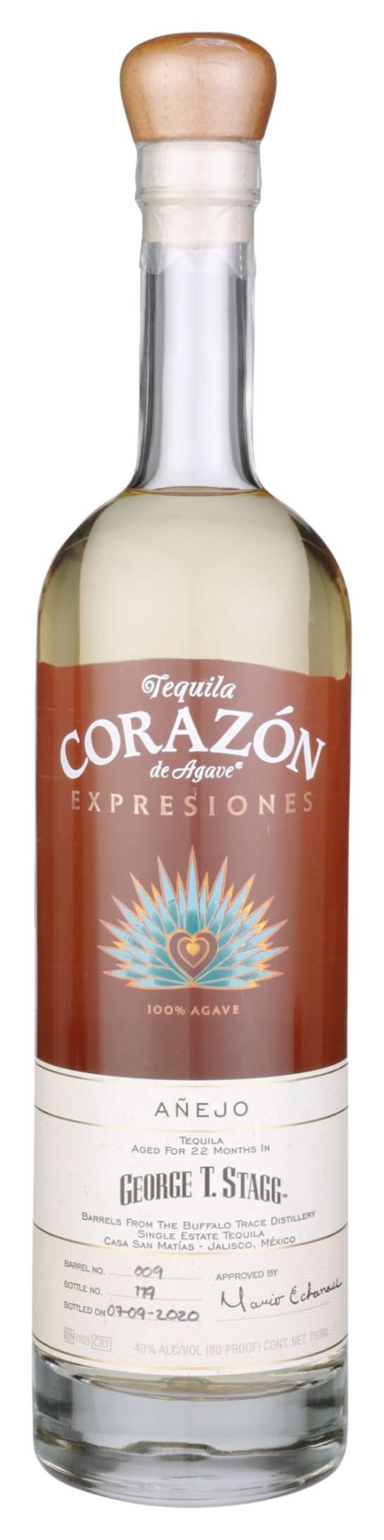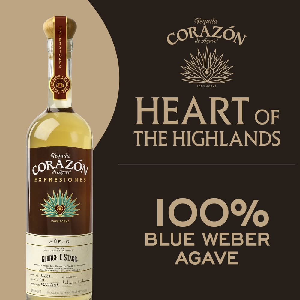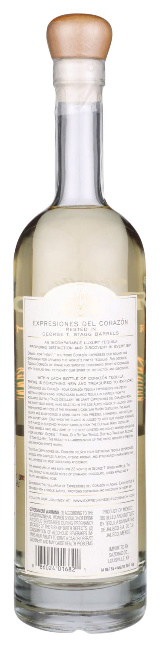 Experience distinction and discovery in every sip with Expresiones del Corazon George T. Stagg Anejo Tequila. This luxury tequila is crafted from the finest hand-selected blue agave using time-honored methods and aged for 22 months in George T. Stagg whiskey barrels. Flavors of salted caramel burst on the tongue followed by charred pineapple before a smoky tobacco finish that leaves the mouth with a lingering sweet tobacco flavor. Enjoy the authentic taste of this 80 proof liquor straight or in your favorite tequila cocktails, from a paloma to margaritas, frozen or on the rocks. Store Expresiones del Corazon Artisanal Blanco Tequila at room temperature or store in the freezer to enjoy this blue agave spirit chilled. Corazon Tequila. Heart Matters. Alcohol by volume: 40%