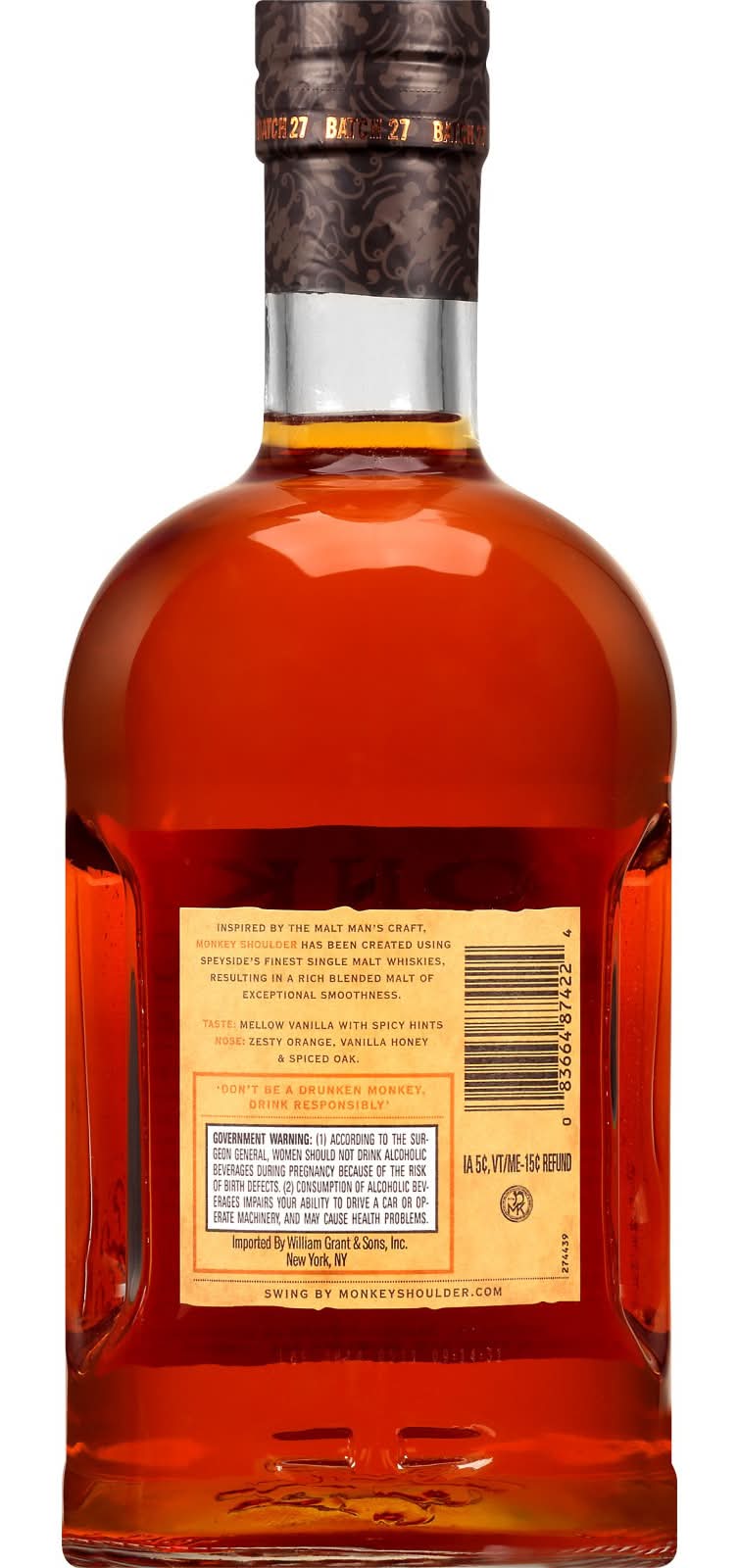 Monkey Shoulder is a blend of Speyside single malt Scotch whiskies which are married together for flavor and consistency. The richness and vibrancy combine with fruity aromas and mellow vanilla, making it perfect for mixed drinks and cocktails. Please drink responsibly. Alcohol by volume: 43%