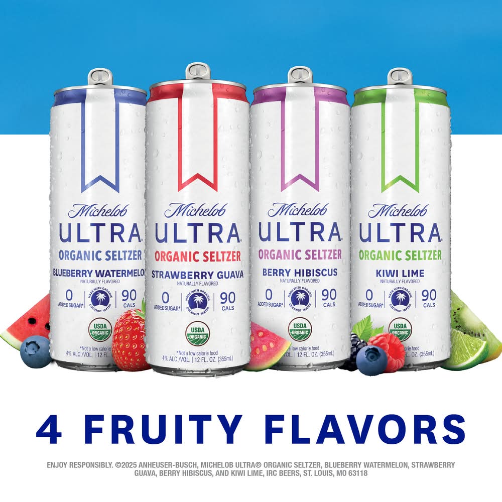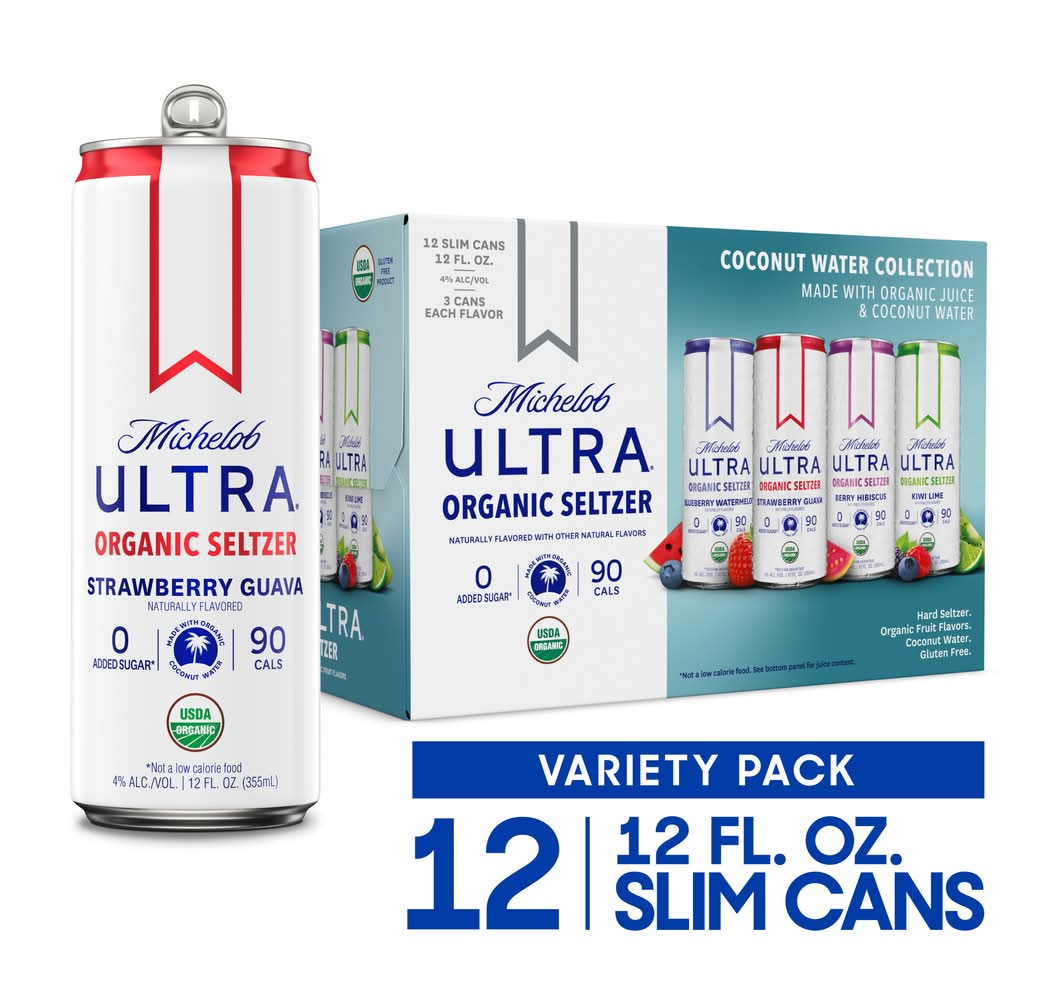 Get ready to experience the perfect blend of refreshing . The expert blending of all-natural flavors provides a well-balanced taste that's never too sweet or too tart. With no added sugars andl., this is a satisfying hard seltzer. No matter what moves you, Michelob Ultra Organic Hard Seltzer Coconut Water Variety Pack is the perfect companion. • Flavor: Strawberry guava-berry hibiscus-kiwi lime-strawberry watermelon • Pack size: 12 • Alcohol by volume: 4% • Packaging: Reusable