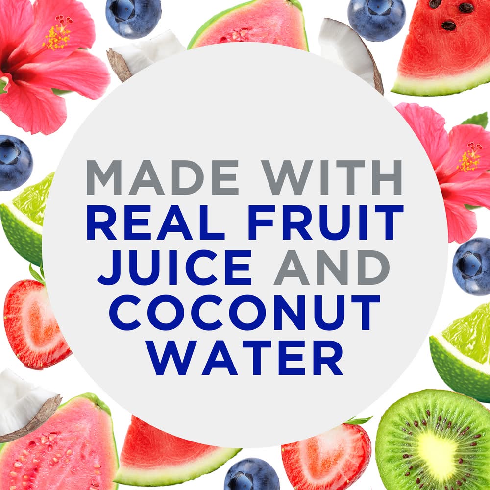 Ingredients: Blueberry Watermelon: Purified Water, Organic Cold-Fermented Cane Sugar, Organic Blueberry, Juice from Concentrate, Organic Natural Flavors, Organic White Grape Juice from Concentrate, Organic Coconut Water from Concentrate, Citric Acid, Organic Stevia Leaf Extract, Organic Malted Rice. Strawberry Guava: Purified Water, Organic Cold-Fermented Cane Sugar, Organic Strawberry Juice from Concentrate, Organic White Grape Juice from Concentrate, Organic Natural Flavors, Organic Coconut Water from Concentrate, Citric Acid, Organic Stevia Leaf Extract, Organic Malted Rice. Berry Hibiscus: Purified Water, Organic Cold-Fermented Cane Sugar, Organic Blueberry Juice from Concentrate, Organic Natural Flavors, Organic White Grape Juice from Concentrate, Organic Coconut Water from Concentrate, Citric Acid, Organic Stevia Leaf Extract, Organic Malted Rice. Kiwi Lime: Purified Water, Organic Cold-Fermented Cane Sugar, Organic White Grape Juice from Concentrate, Organic Kiwi Juice from Concentrate, Organic Coconut Water from Concentrate, Citric Acid, Organic Stevia Leaf Extract, Organic Malted Rice. Contains: Tree Nuts