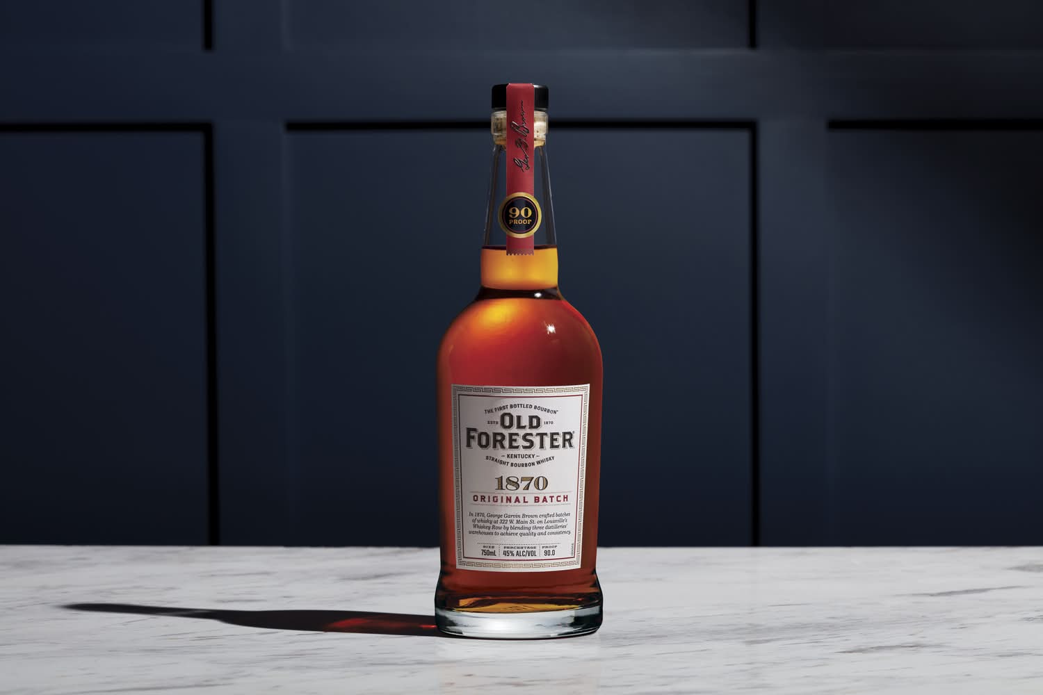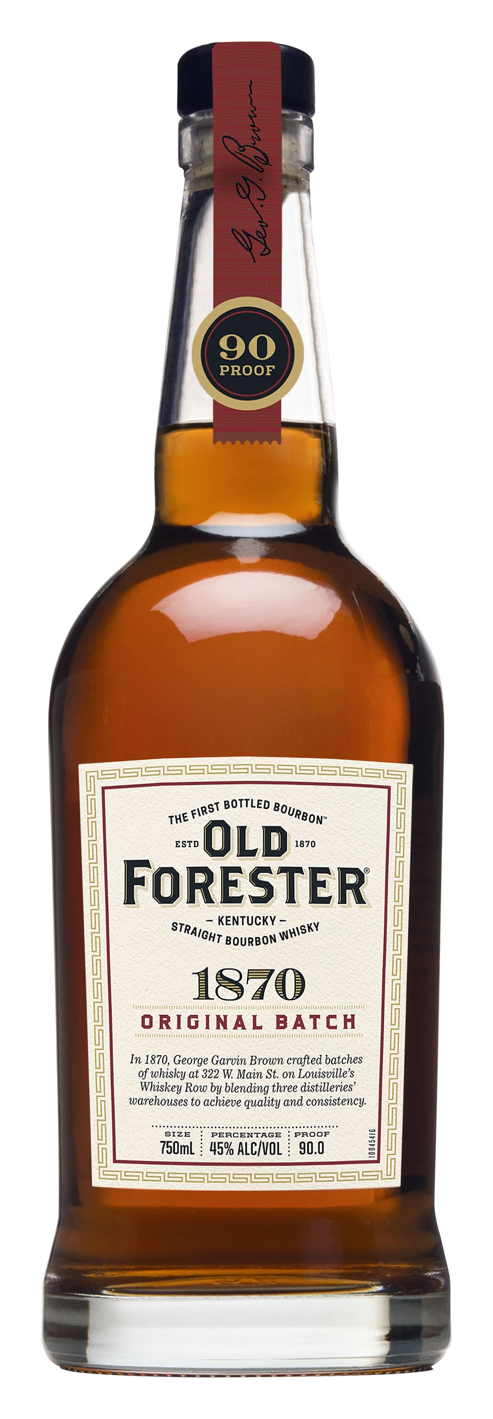 Old Forester 1870 Original Batch Kentucky Straight Bourbon Whisky is the first member of the Old Forester Whiskey Row Series, which invites bourbon lovers to taste their way through Old Forester history with each unique expression. This Kentucky bourbon is made using whisky from select whisky barrels from three warehouses, each barrel originating from a different day of production with a different entry proof and a different age profile. The resulting batch of whisky is light and soft, with lingering fruit and spice character. Try this liquor in mixed drinks, like an Old Fashioned cocktail, enjoy it on the rocks or sip it neat from your favorite glass. This 90 proof whisky boasts aromas of clove and citrus with tastes of baking spices that flow into a shortbread sweetness. Please Sip Responsibly. Alcohol by volume: 45%