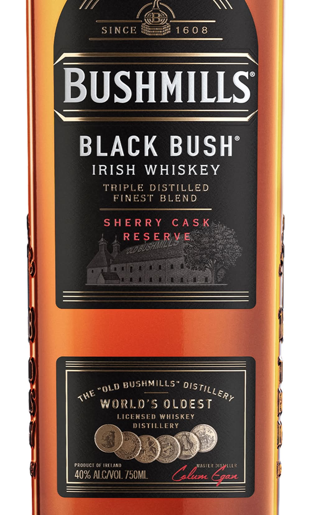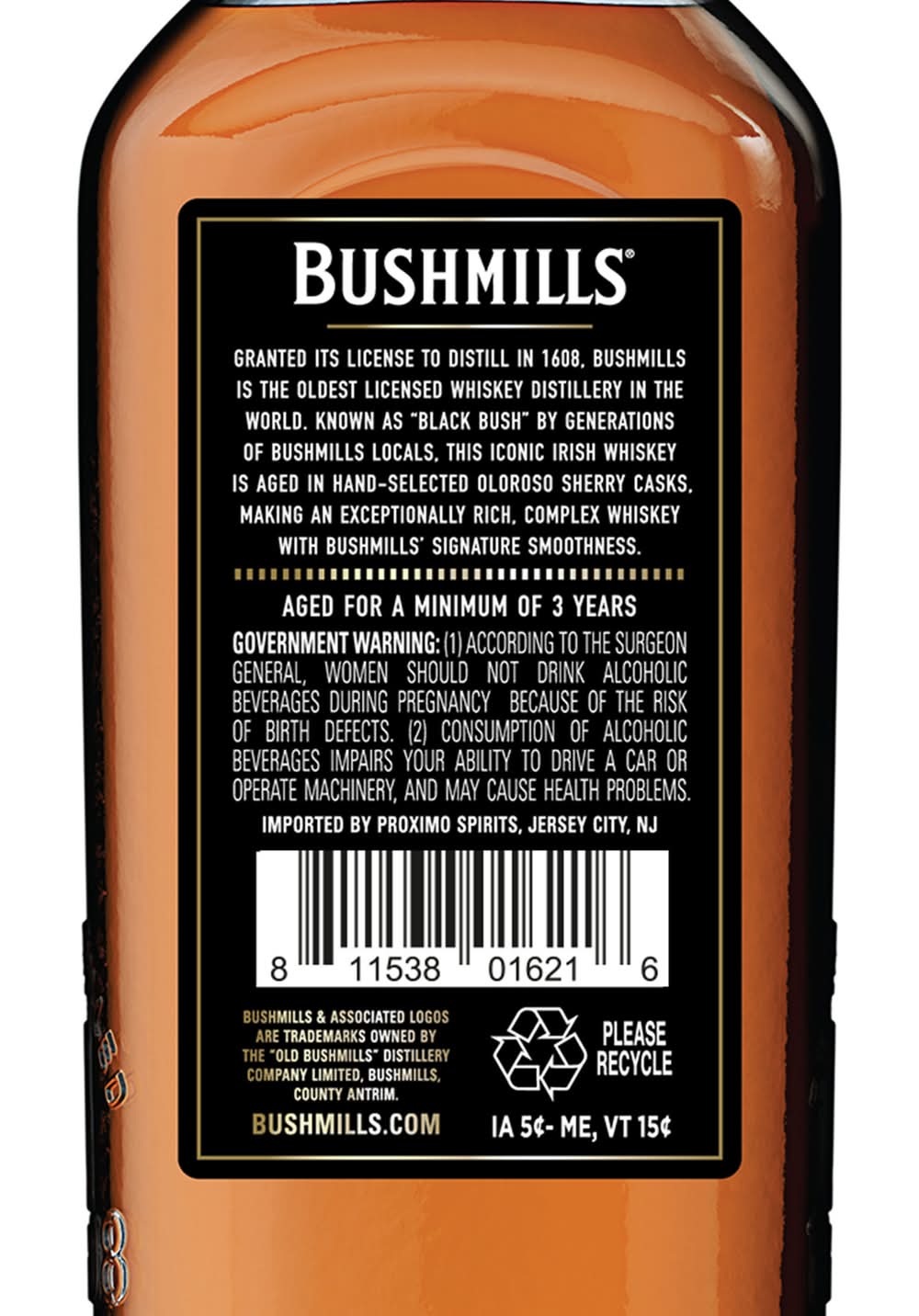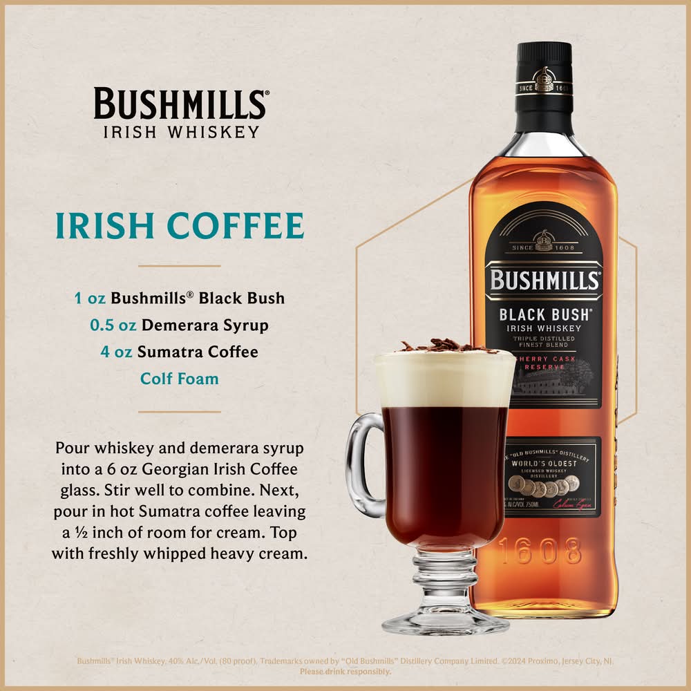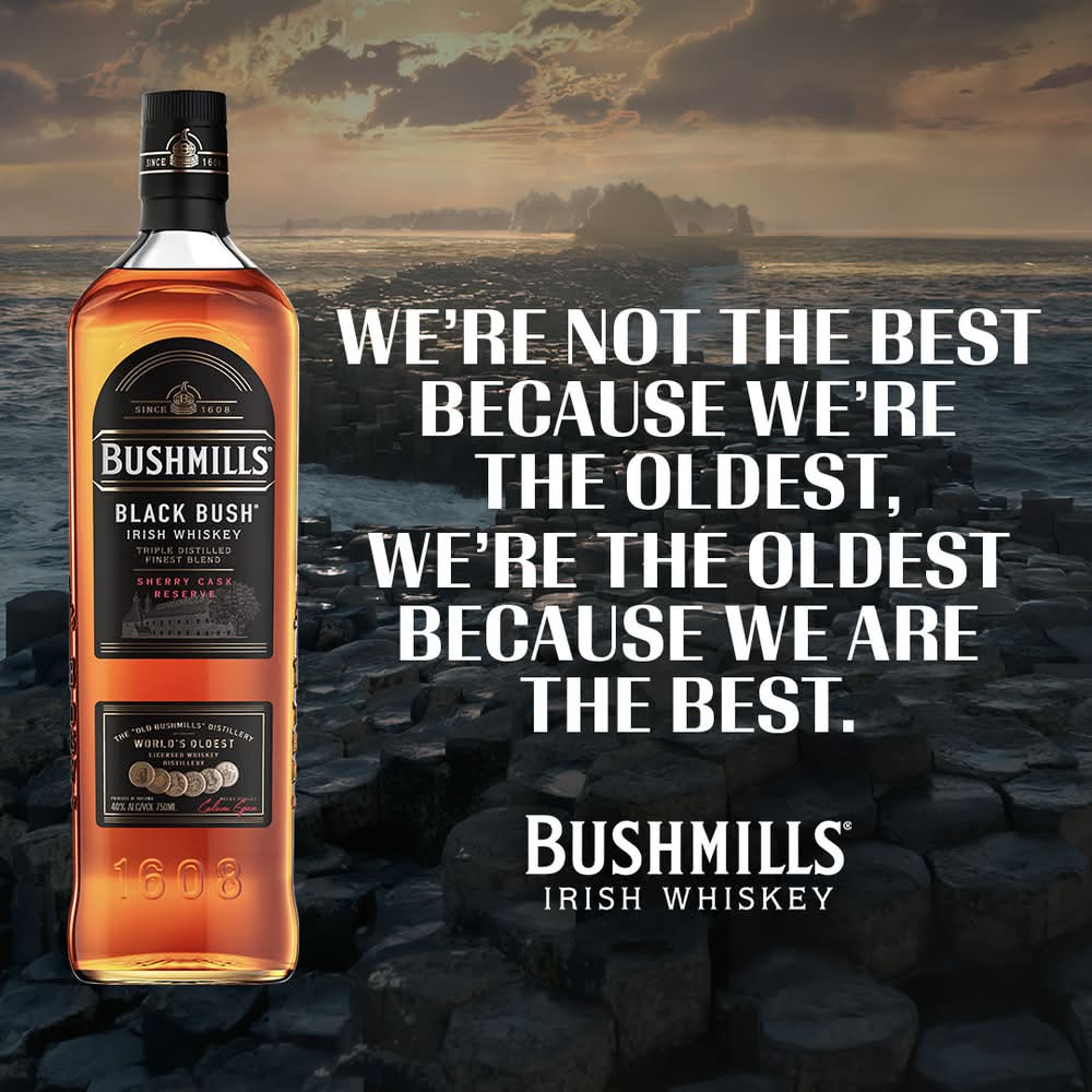 Bushmills® Black Bush® Irish Whiskey is blended from 80% malt and 20% lighter grains, triple-distilled, and then aged up to 8 years in ex-Oloroso Sherry casks. Naturally deep gold in color, it boasts big aromas of rich fruitcake and intense sherry sweetness. Its soft, silky flavor is full and of nutty character. Complex, and deserving of its fame in Ireland as one of the country's truly great whiskeys. • Wine Enthusiast: 96 Points (40% ABV – 80 proof) • Alcohol by volume: 40% • Proximo Spirits, Jersey City, NJ • Packaging: Reusable
