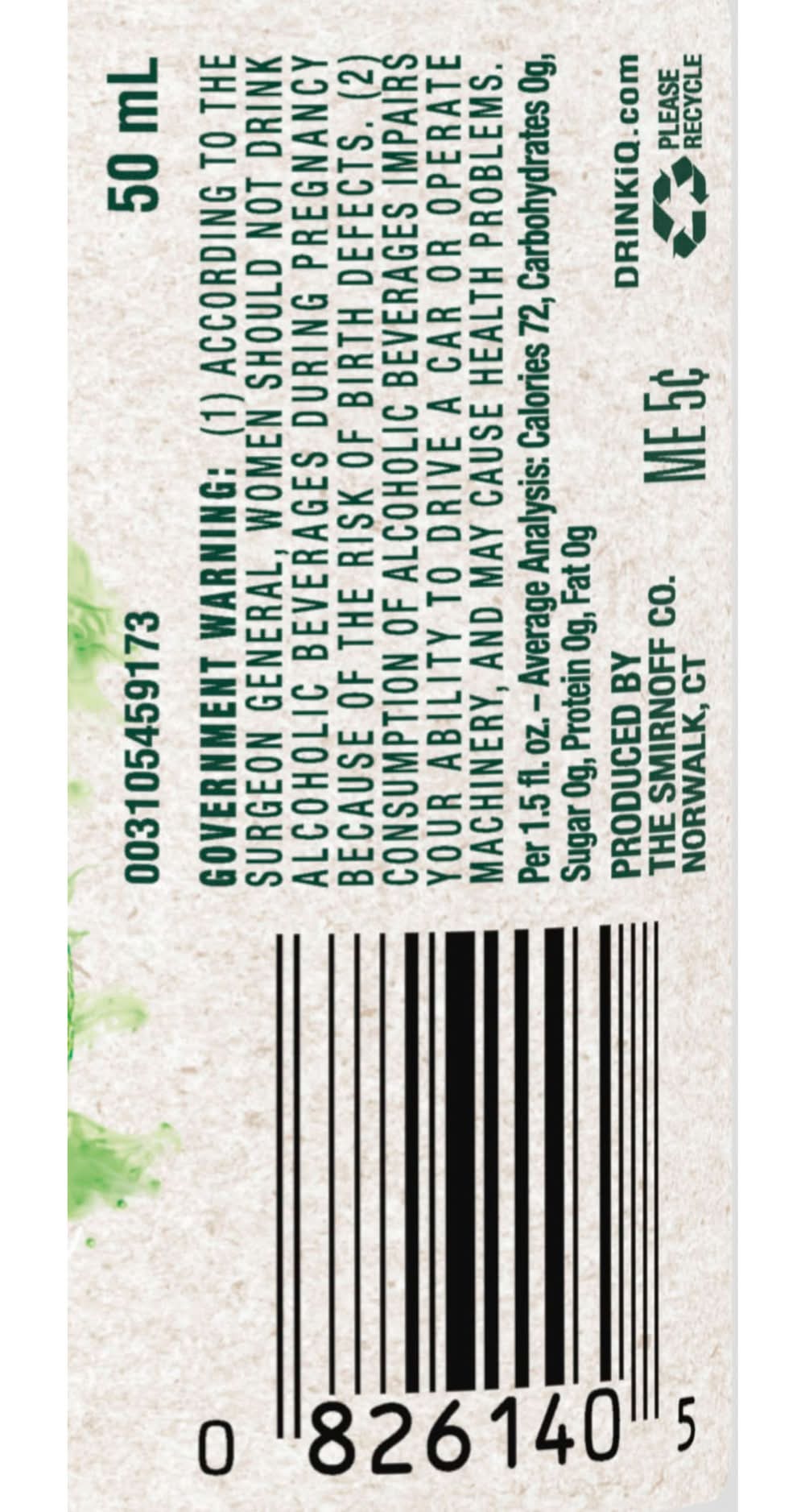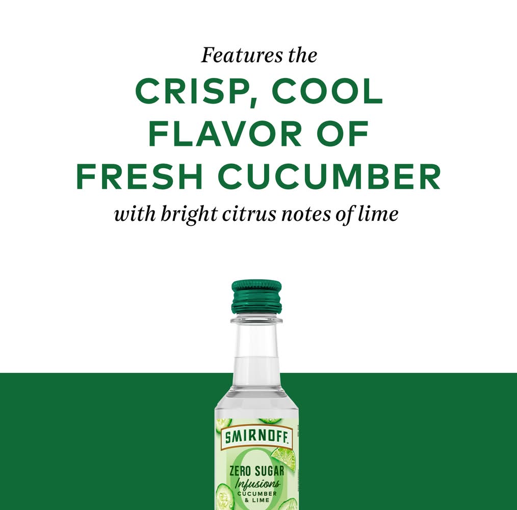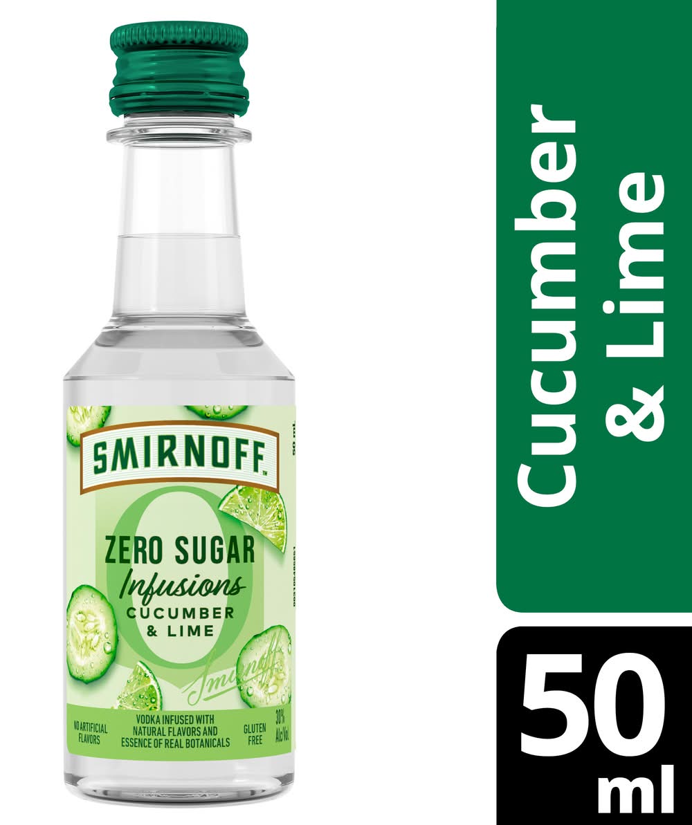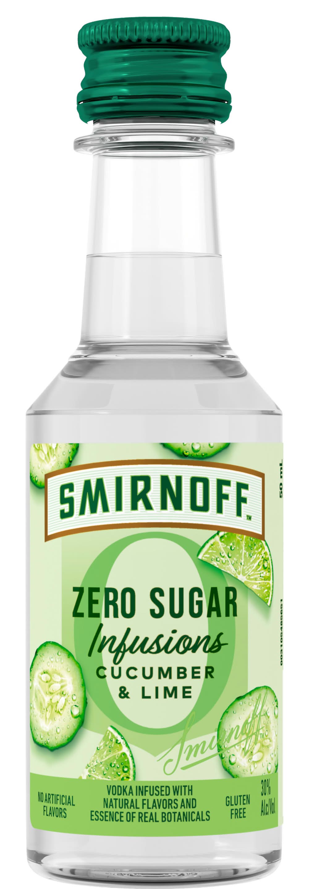 Enjoy the perfectly balanced flavor of Smirnoff Zero Sugar Infusions Cucumber & Lime, made with zero sugar and no artificial flavors for a refreshing-tasting drink. This 60 proof spirit features the crisp, cool flavor of fresh cucumber with bright citrus notes of lime to make a splash at any occasion. Simply mix with some club soda, garnish with a cucumber ribbon and lime wedge, and done. Smirnoff Zero Sugar Infusions Cucumber & Lime was awarded a Gold medal two years in a row in 2021 and 2020 at the San Francisco World Spirits Competition. Includes one 60 proof 50 mL bottle of Smirnoff Zero Sugar Infusions Cucumber & Lime. Please drink responsibly. Per 1.5 fl oz - Average Analysis: Calories - 72; Carbohydrates - 0 g; Sugar - 0 g; Protein - 0g; Fat - 0g. Alcohol by volume: 30%