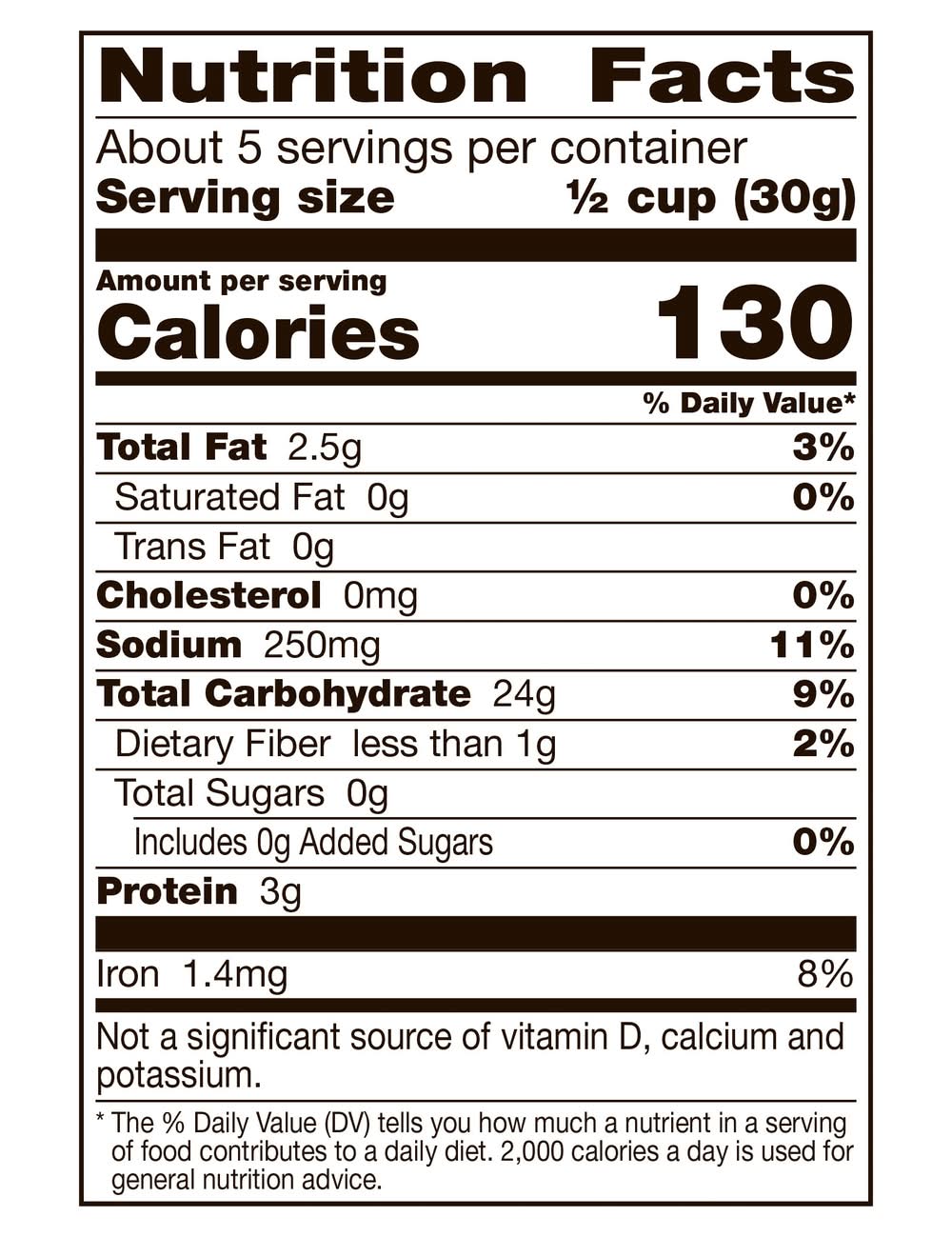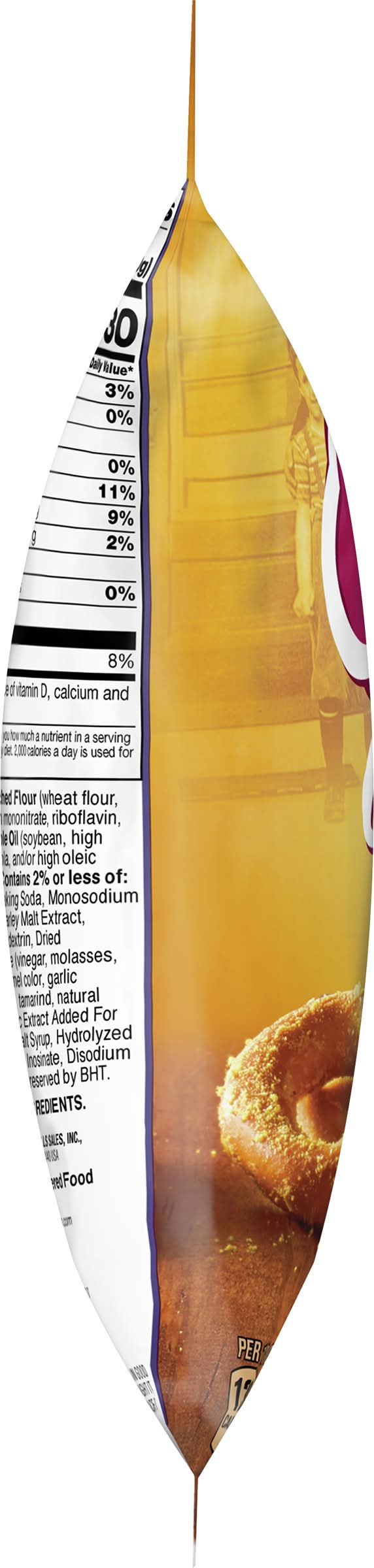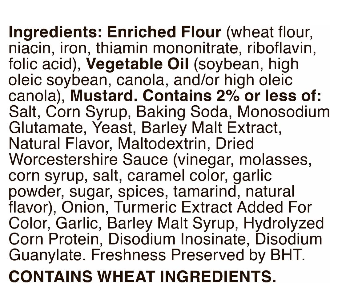 Ingredients: Enriched Flour (Wheat Flour, Niacin, Iron, Thiamin Mononitrate, Riboflavin, Folic Acid), Vegetable Oil (Soybean, High Oleic Soybean, Canola, and/or High Oleic Canola), Mustard, Contains 2% or Less of: Salt, Corn Syrup, Baking Soda, Monosodium Glutamate, Yeast, Barley Malt Extract, Natural Flavor, Maltodextrin, Dried Worcestershire Sauce (Vinegar, Molasses, Corn Syrup, Salt, Caramel Color, Garlic Powder, Sugar, Spices, Tamarind, Natural Flavor), Onion, Turmeric Extract Added for Color, Garlic, Barley Malt Syrup, Hydrolyzed Corn Protein, Disodium Inosinate, Disodium Guanylate, Freshness Preserved by BHT Contains: Wheat, Soybeans, Mustard, Barley, Corn
