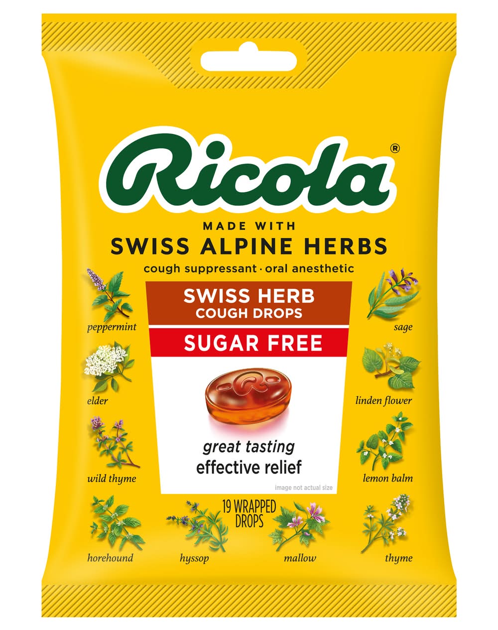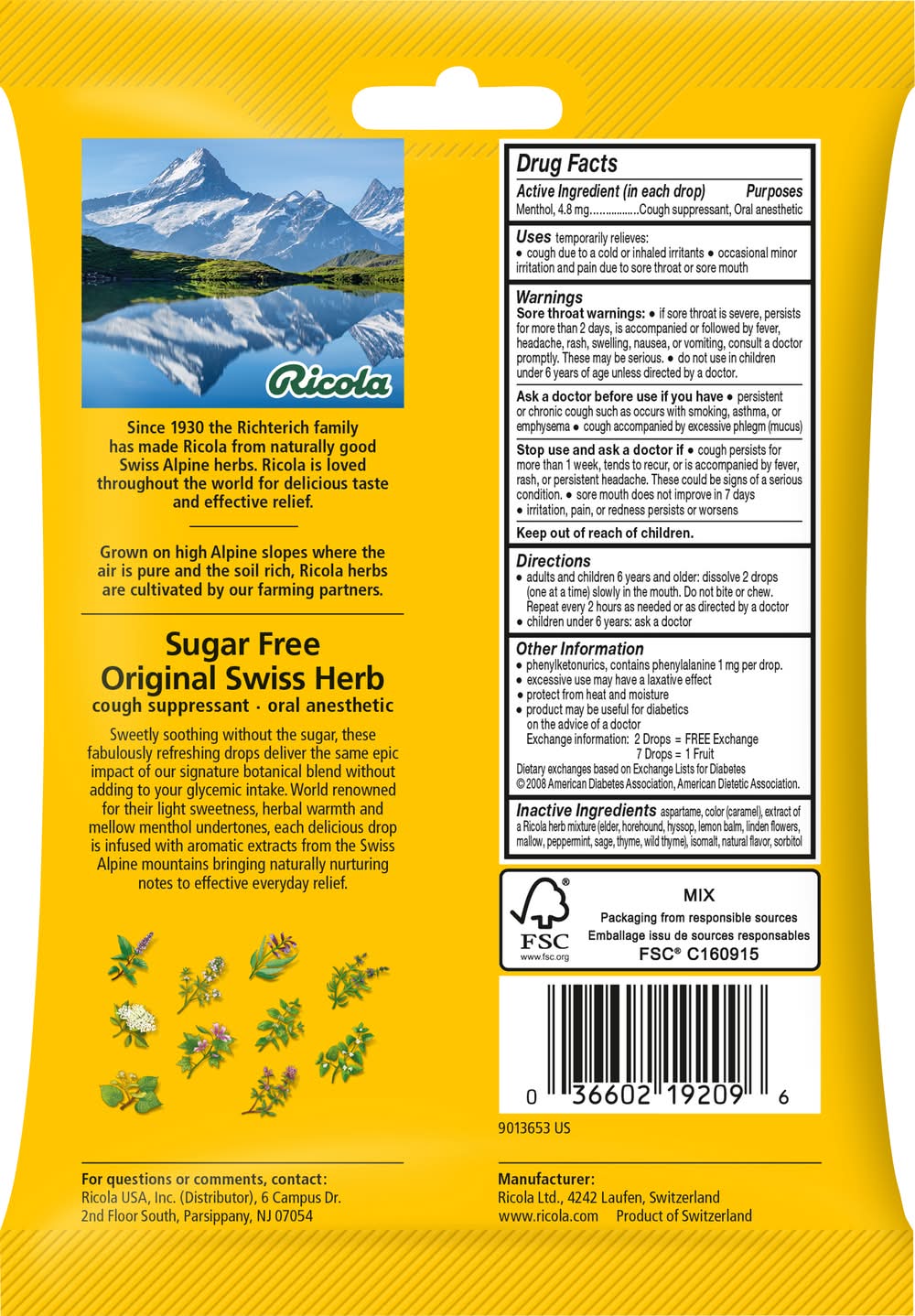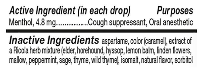 Ingredients: In Each Drop Active Ingredients: Menthol (4.8 mg), Cough Suppressant, Oral Anesthetic. Inactive Ingredients: Aspartame, Color (Caramel), Extract of a Ricola Herb Mixture (Elder, Horehound, Hyssop, Lemon Balm, Linden Flowers, Mallow, Peppermint, Sage, Thyme, Wild Thyme), Isomalt, Natural Flavor, Sorbitol