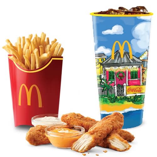 3 tiras de pechuga de pollo empanado. Incluye papas fritas grandes y bebida grande de 30oz. Vaso de cristal no disponible.