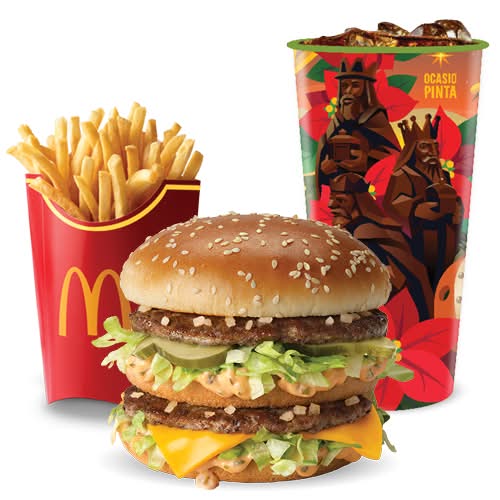 Hamburguesa con dos carnes en pan con semillas de sésamo, salsa especial, cebolla, pepinillos, lechuga y queso. Incluye papas fritas grandes y bebida grande de 30oz. Vaso de cristal no disponible.
