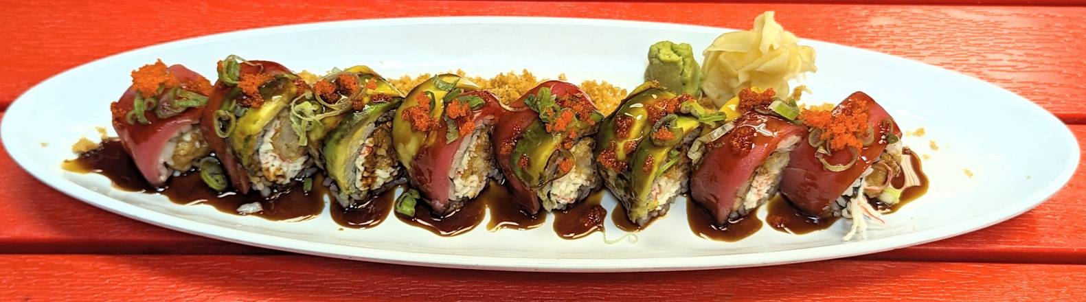 Yellowfin tuna and avocado on top. Shrimp tempura and spicy crab salad inside. Garnished with masago, green onions, eel sauce and ponzu.