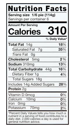 Essential Everyday Old Fashioned Apple Crumb Pie offers a flaky crust crafted from 100% vegetable shortening paired with a bakery-made filling. Each serving contains 360 calories, 7g of saturated fat, 340mg of sodium, and 23g of total sugars. This pre-baked dessert is ready to serve, providing a convenient and enjoyable treat.