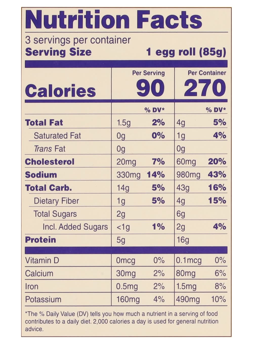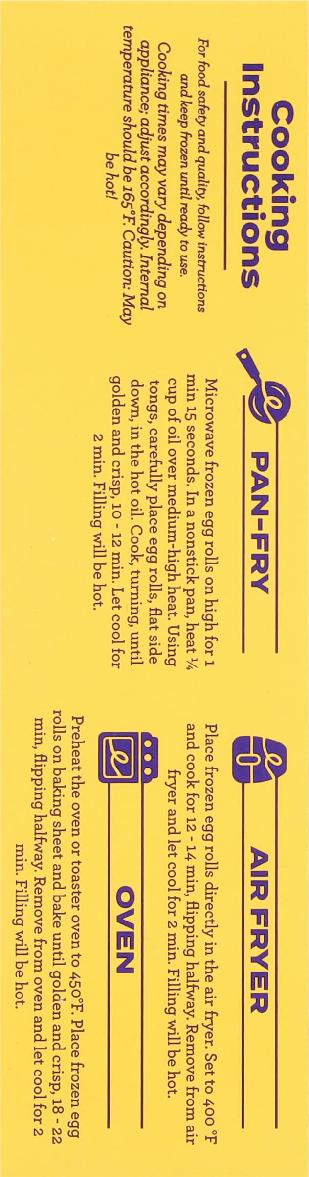 Directions for use: Safe Handling Instructions: This product was prepared from inspected and passed meat and/or poultry. Some food products may contain bacteria that could cause illness if the product is mishandled or cooked improperly. For your protection, follow these safe handling instructions. Keep refrigerated or frozen. Thaw in refrigerator or microwave. Keep raw meat and poultry separate from other foods. Wash working surfaces (including cutting boards), utensils, and hands after touching raw meat or poultry. Cook thoroughly. Keep hot foods hot. Refrigerate leftovers immediately or discard. Cooking Instructions: Oven: Preheat the oven or toaster to 400 degrees F. Place egg rolls on baking sheet and bake until golden and crisp, 20-24 min. Pan-Fry: Microwave the egg rolls on high for 30 seconds. In a nonstick pan, heat 1/4 cup of canola oil over medium-high heat. Using tongs, carefully place the egg rolls, flat side down, in the hot oil. Cook, turning, until golden and crisp, 10-12 min. Note: Cook thoroughly. Cooking times may vary depending on oven; adjust accordingly. Internal temperature should be 165 degrees F. For food safety and quality, follow cooking instructions and keep frozen until ready to use. Caution: May be hot! Storage recommendation: Keep frozen.