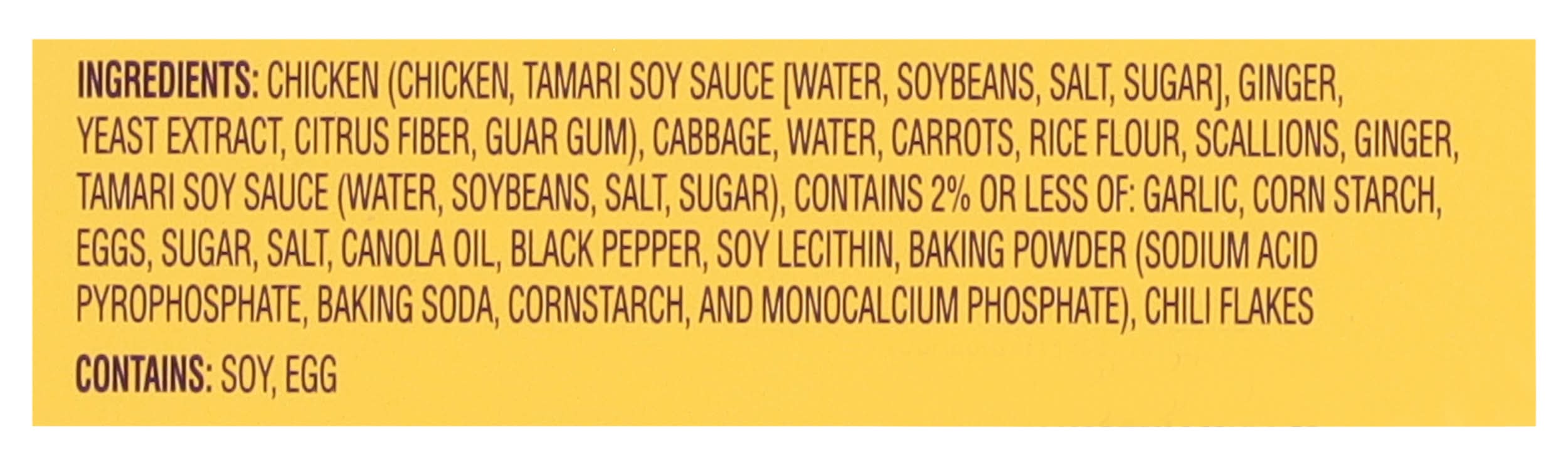 Ingredients: Chicken (Chicken, Tamari Soy Sauce [Water, Soybeans, Salt, Sugar], Ginger, Yeast Extract, Citrus Fiber, Guar Gum), Cabbage, Water, Carrots, Rice Flour, Scallions, Ginger, Tamari Soy Sauce (Water, Soybeans, Salt, Sugar), Contains 2% or Less of: Garlic, Corn Starch, Eggs, Sugar, Salt, Canola Oil, Black Pepper, Soy Lecithin, Baking Powder (Sodium Acid Pyrophosphate, Baking Soda, Cornstarch, and Monocalcium Phosphate), Chili Flakes Contains: Eggs, Soy