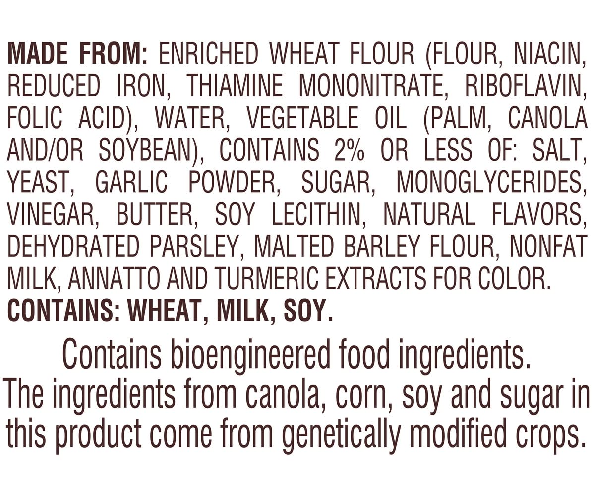 Ingredients: MADE FROM: ENRICHED WHEAT FLOUR (FLOUR, NIACIN, REDUCED IRON, THIAMINE MONONITRATE, RIBOFLAVIN, FOLIC ACID), WATER, VEGETABLE OIL (PALM, CANOLA AND/OR SOYBEAN), CONTAINS 2% OR LESS OF: SALT, YEAST, GARLIC POWDER, SUGAR, MONOGLYCERIDES, VINEGAR, BUTTER, SOY LECITHIN, NATURAL FLAVORS, DEHYDRATED PARSLEY, MALTED BARLEY FLOUR, NONFAT MILK, ANNATTO AND TURMERIC EXTRACTS FOR COLOR. CONTAINS: WHEAT, MILK, SOY Contains: CONTAINS: Gluten, Milk/Dairy, Soybean, Wheat