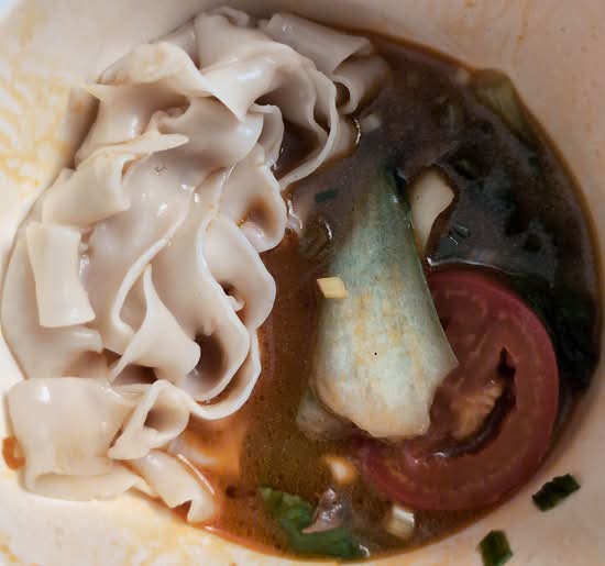 Sliced beef, sirloin, tomato, and bok choy. With sliced noodles.