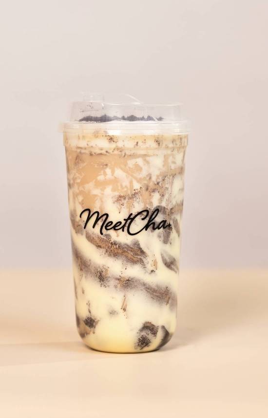 Meetcha's house blend milk tea with homemade crème brulee and Oreo crumbs.
