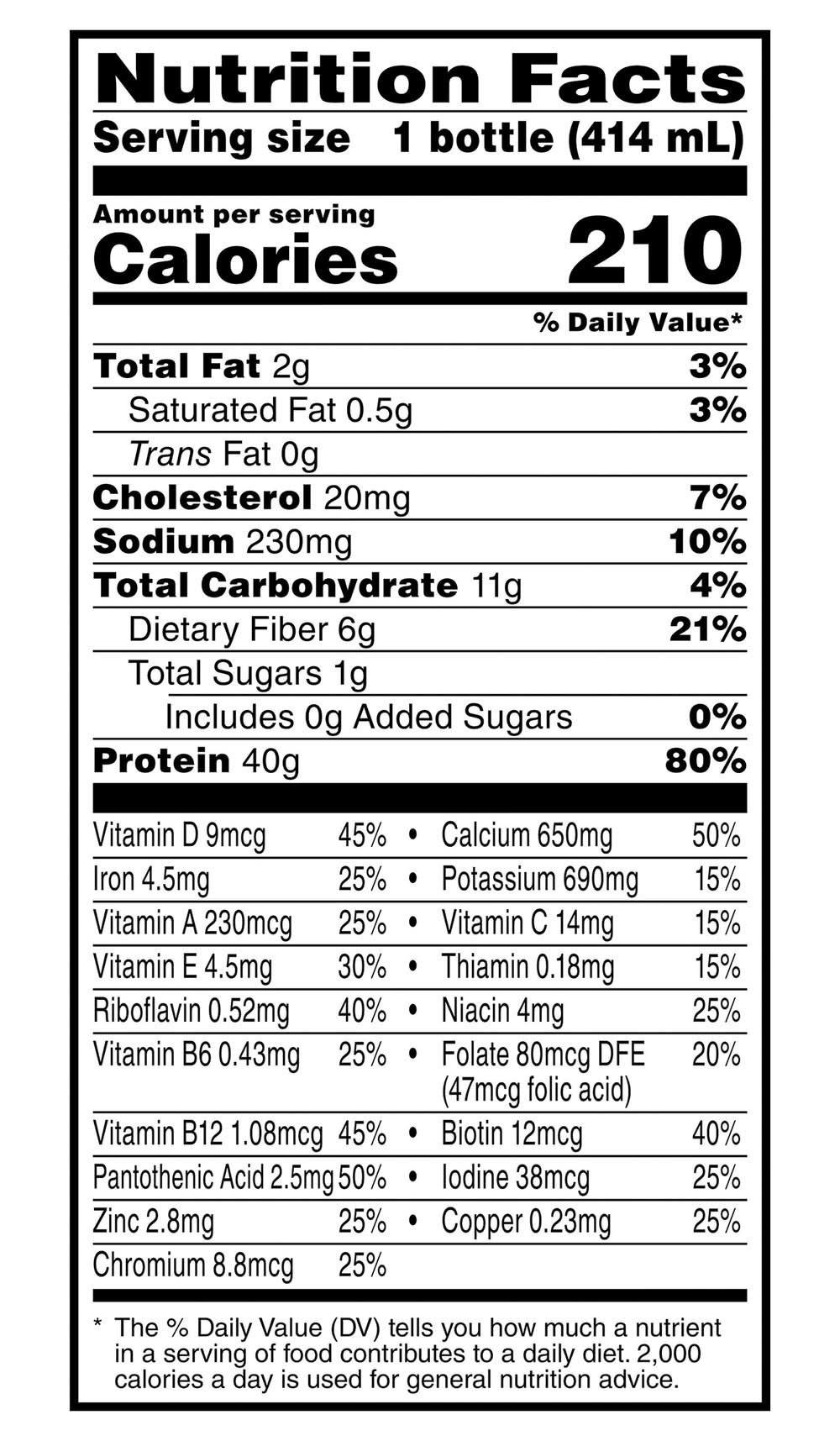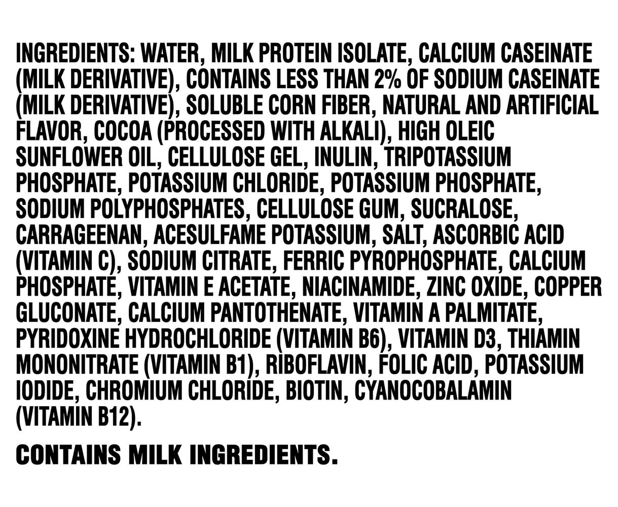 Ingredients: Water, Milk Protein Isolate, Calcium Caseinate (Milk Derivative), Contains Less than 2% of Sodium Caseinate (Milk Derivative), Soluble Corn Fiber, Natural and Artificial Flavor, Cocoa (Processed with Alkali), High Oleic Sunflower Oil, Cellulose Gel, Inulin, Tripotassium Phosphate, Potassium Chloride, Potassium Phosphate, Sodium Polyphosphates, Cellulose Gum, Sucralose, Carrageenan, Acesulfame Potassium, Salt, Ascorbic Acid (Vitamin C), Sodium Citrate, Ferric Pyrophosphate, Calcium Phosphate, Vitamin E Acetate, Niacinamide, Zinc Oxide, Copper Gluconate, Calcium Pantothenate, Vitamin A Palmitate, Pyridoxine Hydrochloride (Vitamin B6), Vitamin D3, Thiamin Mononitrate (Vitamin B1), Riboflavin, Folic Acid, Potassium Iodide, Chromium Chloride, Biotin, Cyanocobalamin (Vitamin B12) Contains: Milk