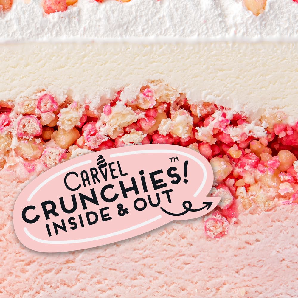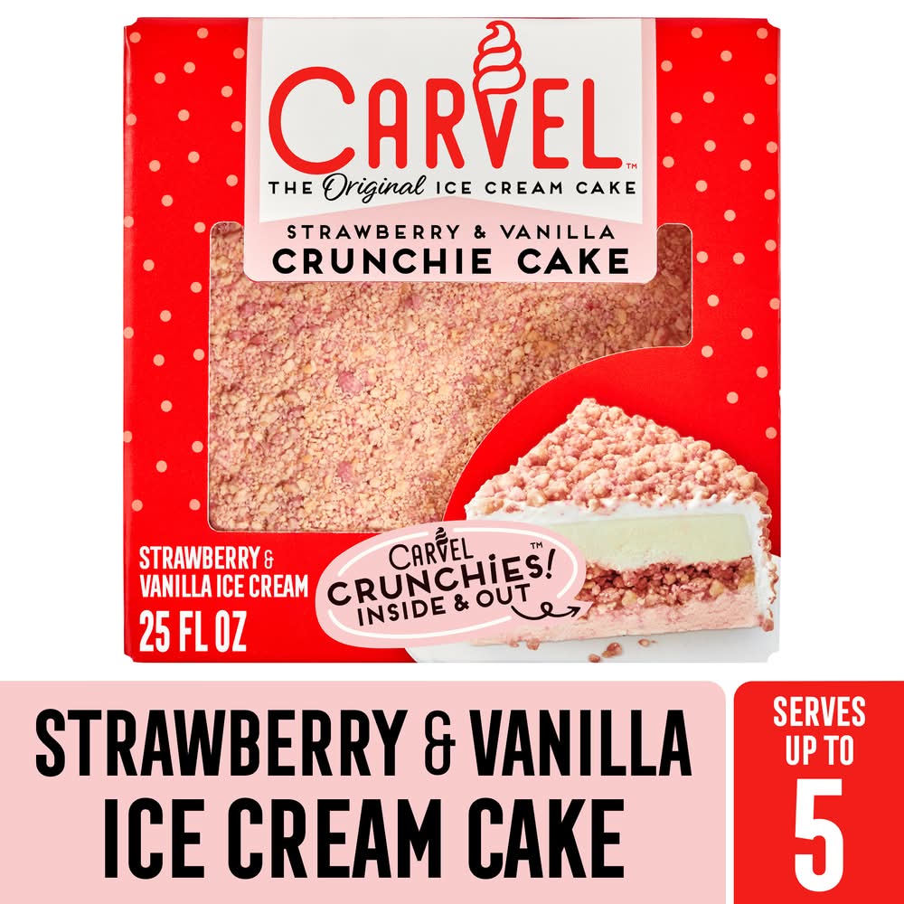 Ice cream covered in creamy whipped icing & loaded with crunchies. Naturally & artificially flavored. New! I love Carvel crunchies! It all started with a smile. Back in 1934, Tom Carvel had and a dream to make people smile. Carvel Ice Cream Cakes can be found in supermarkets all over the nation. We've become an American favorite and the goal is still very simple - to make people smile. • Flavor: Strawberry-vanilla • Rich Products, One Robert Rich Way Buffalo, NY 14213 United States