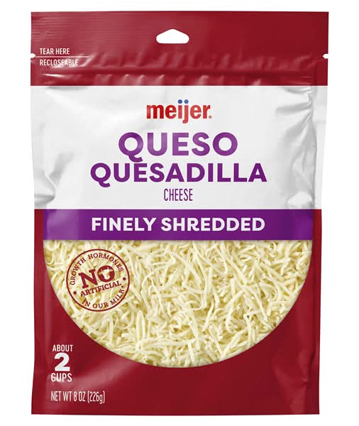 Meijer Finely Shredded Queso Quesadilla Cheese is made with real milk and comes pre-shredded for convenience. It is suitable for a variety of dishes, including melting over a tortilla with chicken or for use in spicy chicken chile rellenos.