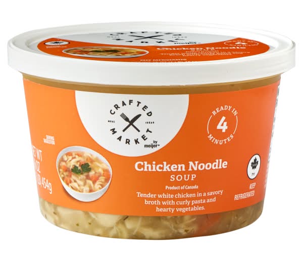 Crafted Market by Meijer Chicken Noodle Soup is a savory delight, featuring tender white chicken, curly pasta, and hearty vegetables in a flavorful broth. With ingredients like carrots, celery, onions, and a hint of thyme and dill weed, this soup offers a comforting, home-cooked taste that's perfect for any meal. Packaging: Reusable