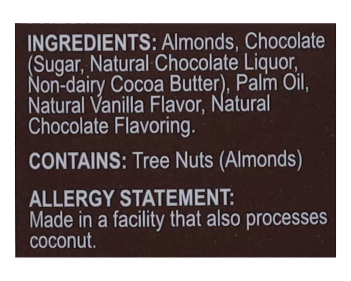 Ingredients: Almonds, Chocolate (Sugar, Natural Chocolate Liquor, Non-Dairy Cocoa Butter), Palm Oil, Natural Vanilla Flavor, Natural Chocolate Flavoring Contains: Tree Nuts, Almonds, Tree Nuts, Tree Nuts, Coconuts