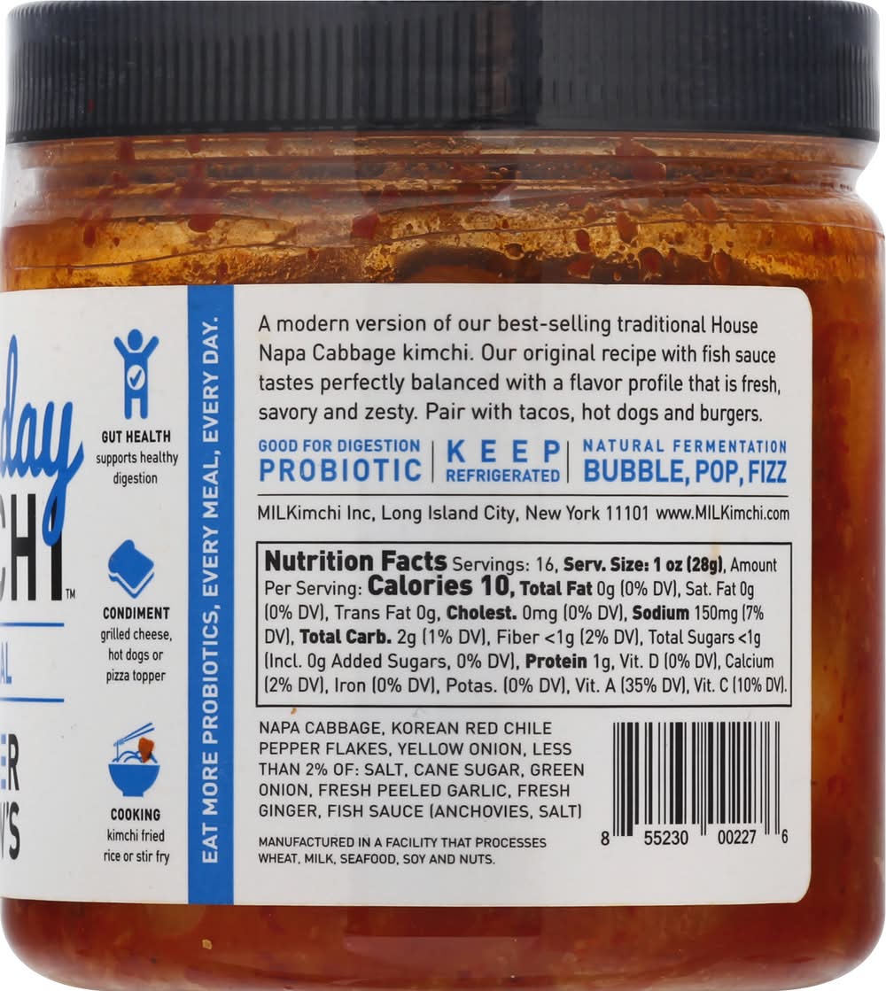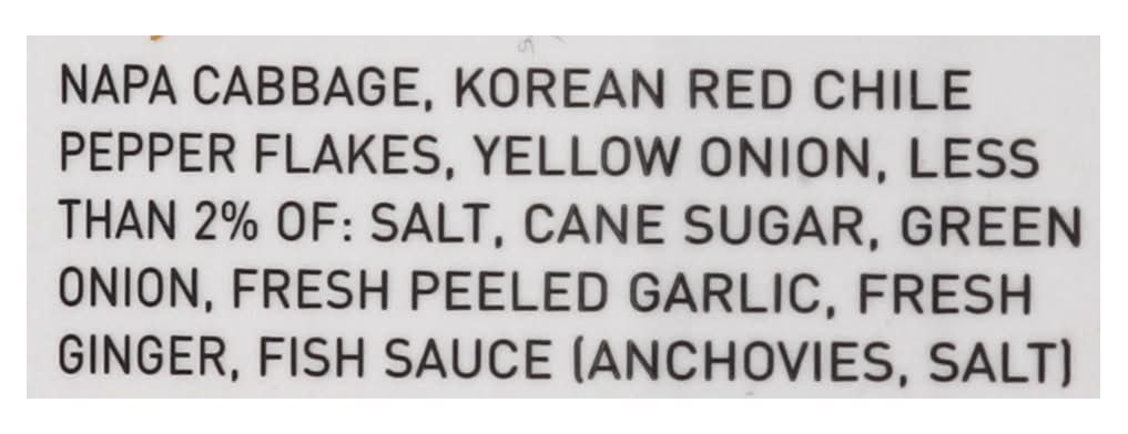 Ingredients: Napa Cabbage, Korean Red Chile Pepper Flakes, Yellow Onion, Less Than 2% of Salt, Cane Sugar, Green Onion, Fresh Peeled Garlic, Fresh Ginger, Fish Sauce (Anchovies, Salt) Contains: Fish, Wheat, Milk, Crustacean Shellfish, Soybeans, Tree Nuts