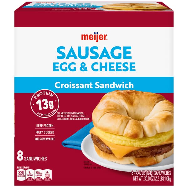 Start Your Day With A Meijer Sausage, Egg & Cheese Croissant. Each Pack Contains 8 Individually Wrapped, Ready-to-heat Croissants Filled With Savory Sausage, Fluffy Eggs, And Melted Cheese. It's A Convenient And Delicious Option For Breakfast On The Go. Pack size: 8
