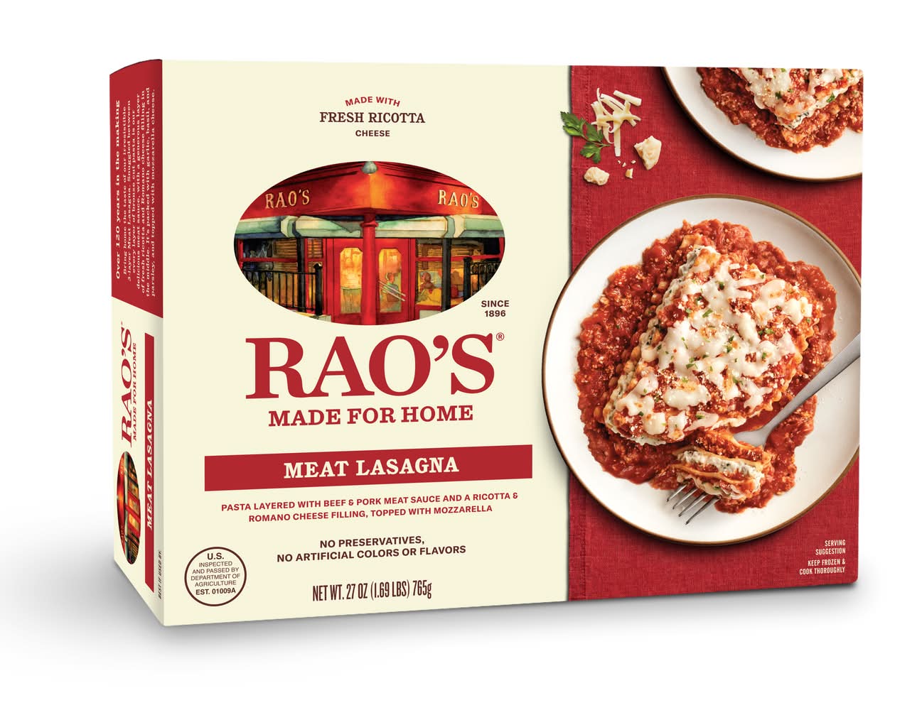 Bring home the taste of our irresistible 3-layer Meat Lasagna. Snuggled between every layer of bronze cut pasta is our legendary marinara and meat sauces with a fresh ricotta and romano cheese filling. It's packed with garlic, basil and parsley, and topped with mozzarella. US inspected and passed by Department of Agriculture. Packaging: Reusable