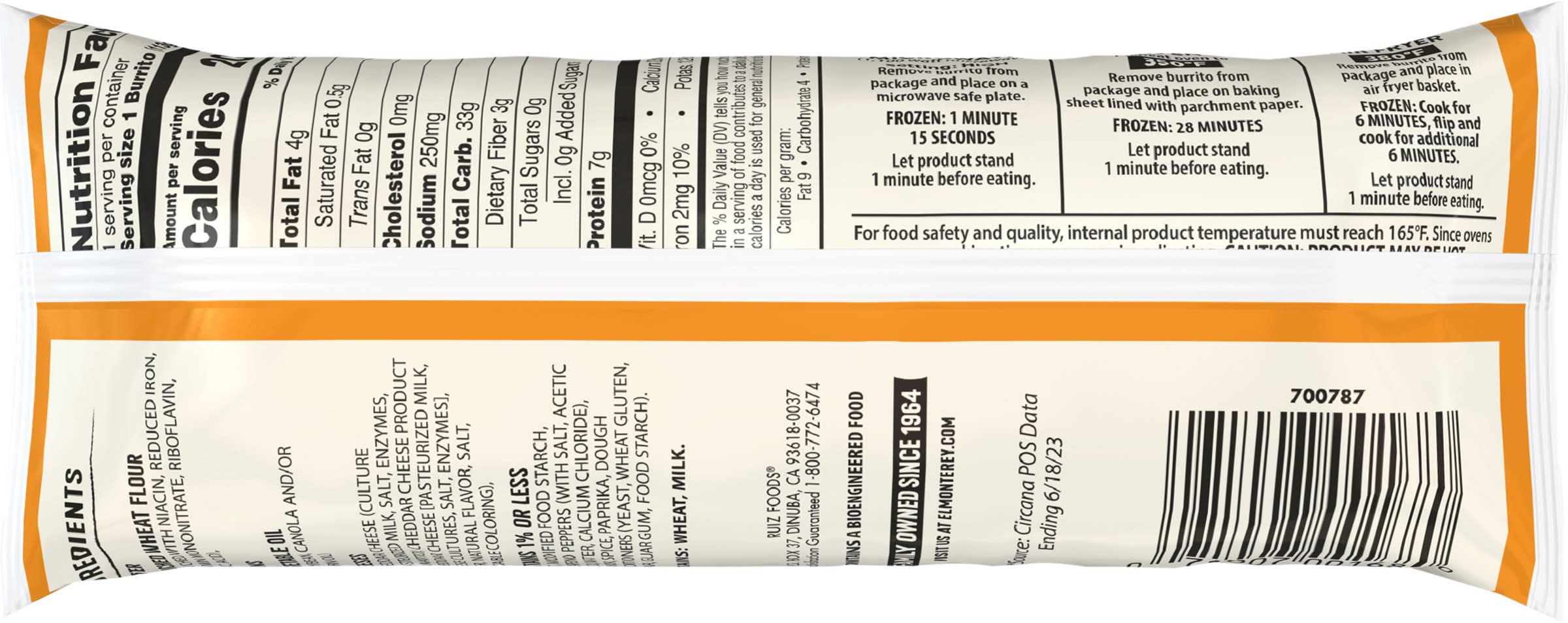 Ingredients: Water, Enriched Wheat Flour (Enriched with Niacin, Reduced Iron, Thiamin Mononitrate, Riboflavin, Folic Acid), Beans, Vegetable Oil (Soybean, Canola and/or Corn Oil), Cheeses: Cheddar Cheese (Culture Pasteurized Milk, Salt, Enzymes, Annatto), Cheddar Cheese Product (Cheddar Cheese [Pasteurized Milk, Cheese Cultures, Salt, Enzymes], Water, Natural Flavor, Salt, Vegetable Coloring), Contains 1% or Less Salt, Modified Food Starch, Jalapeno Peppers (with Salt, Acetic Acid, Water, Calcium Chloride), Flavor, Spice, Paprika, Dough Conditioners (Yeast, Wheat Gluten, Sugar, Guar Gum, Food Starch) Contains: Wheat, Milk, Gluten, Corn, Soybeans