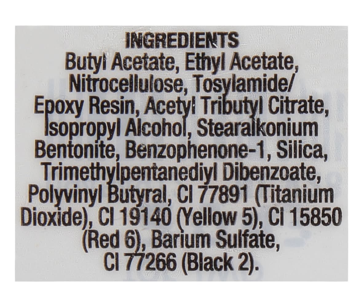 Ingredients: Butyl Acetate, Ethyl Acetate, Nitrocellulose, Tosylamide/Epoxy Resin, Acetyl Tributyl Citrate, Isopropyl Alcohol, Stearalkonium Bentonite, Benzophenone-1, Silica, Trimethylpentanediyl Dibenzoate, Polyvinyl Butyral, CI 77891 (Titanium Dioxide), CI 19140 (Yellow 5 ), CI 15850 (Red 6), Barium Sulfate, CI 77266 (Black 2)