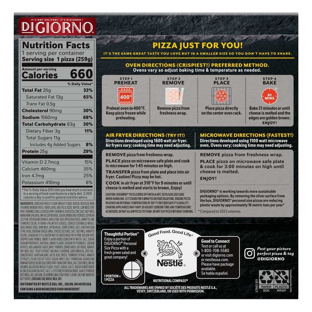 Thoughtful Portion ™ Enjoy a Portion of DiGiorno® Personal Size Pizza with a fresh green salad and great company! 1 Portion = 1 Pizza, It's Not Delivery. It's DiGiorno ®. 25g Protein, Flaky & Buttery Layers, Pizza just for you! It's the same great taste you love but in a smaller size so you don't have to share. Post your picture perfect pizza & tag @DIGIORNO, Personal Size, Try In Your Air Fryer, DiGiorno is working towards more sustainable packaging options. By removing the silver surface from the box, DiGiorno personal size pizzas are reducing plastic waste by approximately 16 metric tons per year* *(compared to 2023 volumes) • Flavor: Canadian bacon-egg scramble • Packaging: Reusable