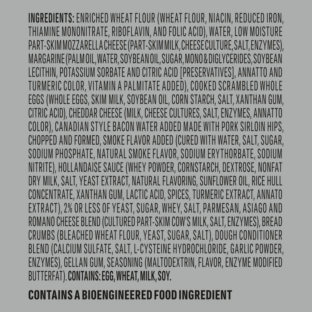 Ingredients: ENRICHED WHEAT FLOUR (WHEAT FLOUR, NIACIN, REDUCED IRON, THIAMINE MONONITRATE, RIBOFLAVIN, AND FOLIC ACID), WATER, LOW-MOISTURE PART-SKIM MOZZARELLA CHEESE (PART-SKIM MILK, CHEESE CULTURE, SALT, ENZYMES), MARGARINE (PALM OIL, WATER, SOYBEAN OIL, SUGAR, MONO DIGLYCERIDES, SOYBEAN LECITHIN, POTASSIUM SORBATE AND CITRIC ACID [PRESERVATIVES], ANNATTO AND TURMERIC COLOR, VITAMIN A PALMITATE ADDED), COOKED SCRAMBLED WHOLE EGGS (WHOLE EGGS, SKIM MILK, SOYBEAN OIL, CORN STARCH, SALT, XANTHAN GUM, CITRIC ACID), CHEDDAR CHEESE (MILK, CHEESE CULTURES, SALT, ENZYMES, ANNATTO COLOR), CANADIAN STYLE BACON WATER ADDED MADE WITH PORK SIRLOIN HIPS, CHOPPED AND FORMED, SMOKE FLAVOR ADDED (CURED WITH WATER, SALT, SUGAR, SODIUM PHOSPHATE, NATURAL SMOKE FLAVOR, SODIUM ERYTHORBATE, SODIUM NITRITE), HOLLANDAISE SAUCE (WHEY POWDER, CORNSTARCH, DEXTROSE, NONFAT DRY MILK, SALT, YEAST EXTRACT, NATURAL FLAVORING, SUNFLOWER OIL, RICE HULL CONCENTRATE, XANTHAN GUM, LACTIC ACID, SPICES, TURMERIC EXTRACT, ANNATO EXTRACT), YEAST, SUGAR, WHEY, SALT, PARMESAN, ASIAGO AND ROMANO CHEESE BLEND (CULTURED PART-SKIM COW'S MILK, SALT, ENZYMES), BREAD CRUMBS (BLEACHED WHEAT FLOUR, YEAST, SUGAR, SALT), DOUGH CONDITIONER BLEND (CALCIUM SULFATE, SALT, L-CYSTEINE HYDROCHLORIDE, GARLIC POWDER, ENZYMES), GELLAN GUM, SEASONING (MALTODEXTRIN, FLAVOR, ENZYME MODIFIED BUTTERFAT), . Contains: CONTAINS: EGG, WHEAT, MILK, SOY.