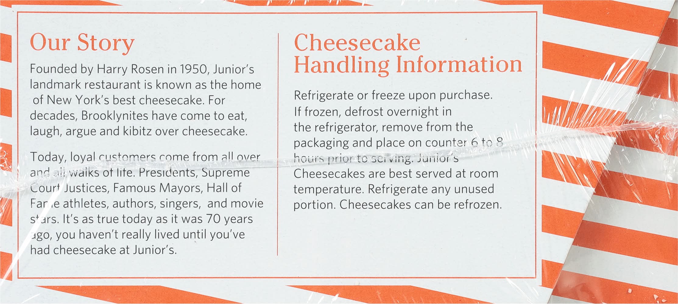 Contains bioengineered food ingredient. Our Story: Founded by Harry Rosen in 1950, landmark restaurant is known as the home of For decades, Brooklynites have come to eat, laugh, argue and kibitz over cheesecake. Today, loyal customers come from all over and all walks of life. Presidents, Supreme Court Justices, Famous Mayors, Hall of Fame athletes, authors, singers, and movie starts. It's as true today as it was 70 years ago, you haven't really lived until you've had cheesecake at Junior's. Our 100% Guarantee: Our name and reputation is on the line with every cheesecake we make so we fully guarantee your absolute satisfaction. If Junior's is not the best, most fabulous cheesecake you've ever sunk your teeth into, • Number of servings: 5 • Juniors Cheesecake & Desserts, Brooklyn, NY, 11201, Ph: 800-4JUNIOR