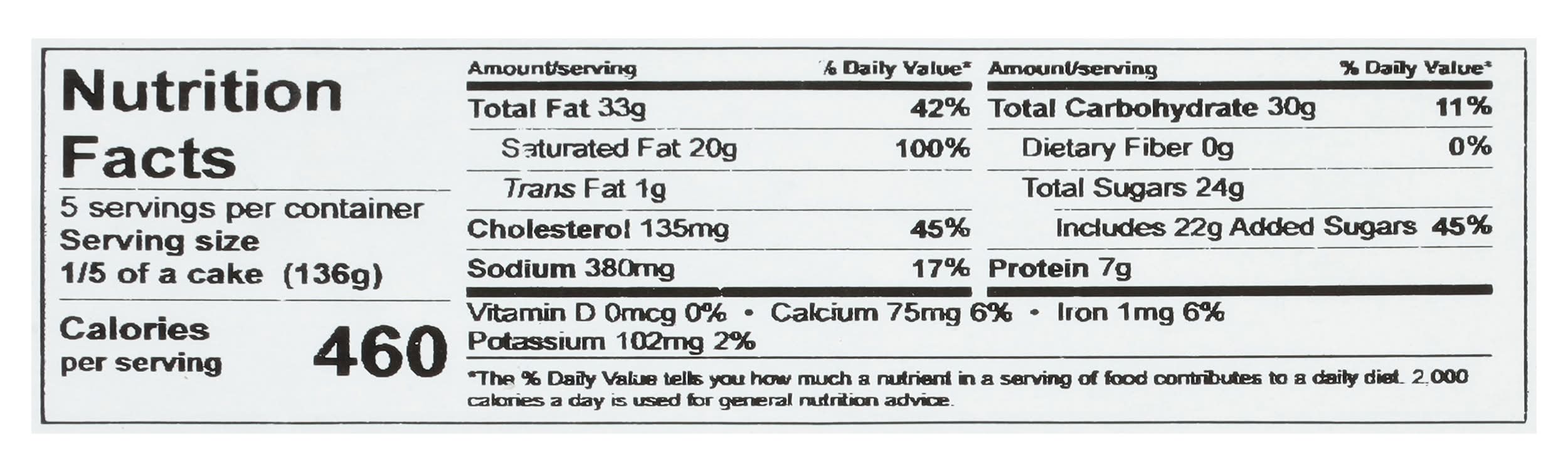 Ingredients: Cream Cheese (Pasteurized Milk and Cream, Salt, Carob Bean Gum, Cheese Culture), Sugar, Heavy Cream, Eggs (Eggs, Citric Acid), Cake Base (Sugar, Enriched Wheat Flour [Wheat Flour, Niacin, Iron, Thiamine Mononitrate, Riboflavin, Folic Acid], Cellulose, Wheat Gluten, Leavening [Sodium Acid Pyrophosphate, Sodium Bicarbonate], Whey [Milk], Salt, Natural Flavor, Xanthan Gum, Guar Gum), Pasteurized Cultured Skim Milk, Water, Contains Less than 2% of the Following: Corn Starch, Soybean Oil, Eggs, Milk Protein, Natural Flavor, Microbial Rennet, Soybean Lecithin Contains: Milk, Eggs, Wheat, Soybeans, Gluten, Corn, Peanuts, Tree Nuts