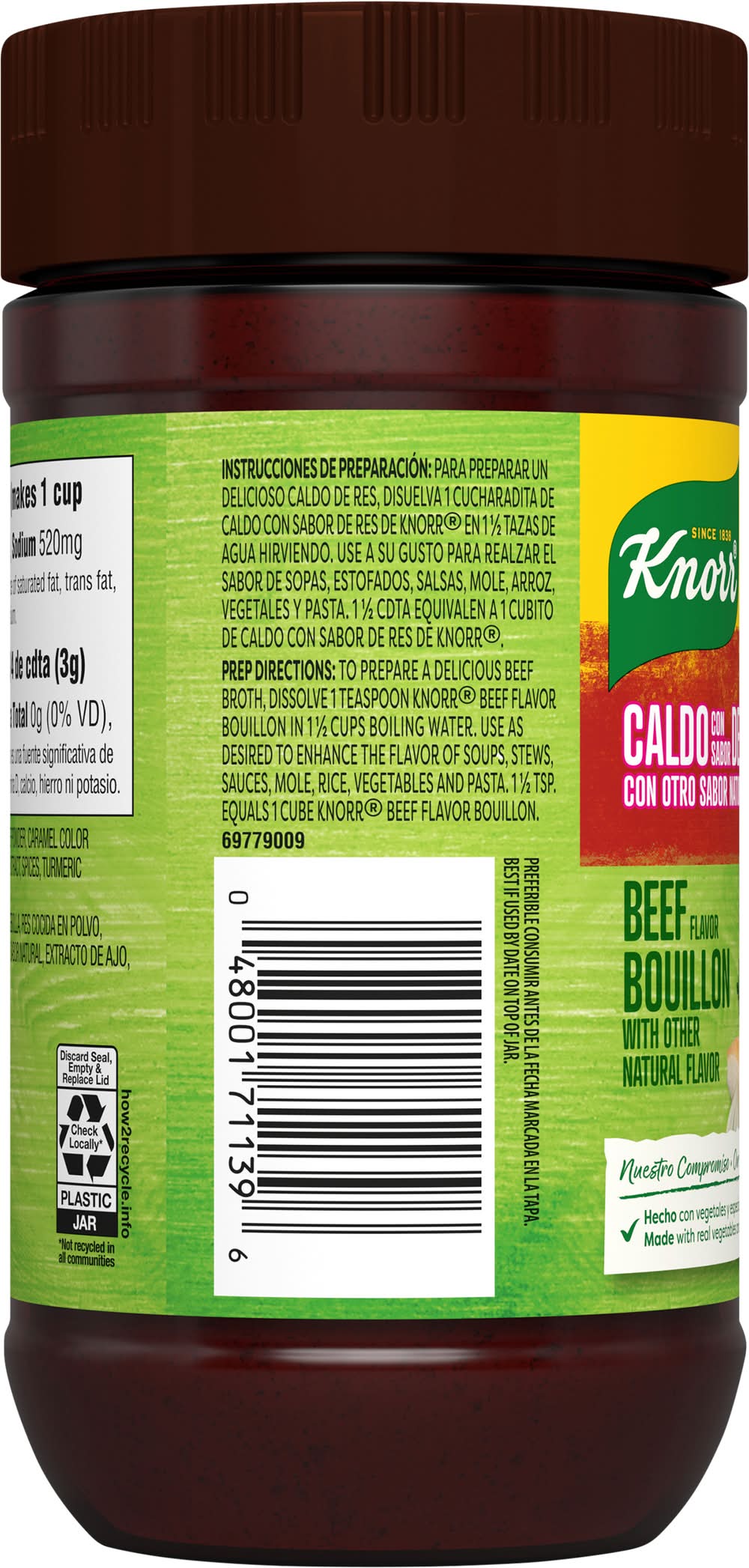 To prepare a delicious beef broth, dissolve 1 teaspoon knorr beef flavor bouillon in 1 cup boiling water. best if used by date on top of jar.