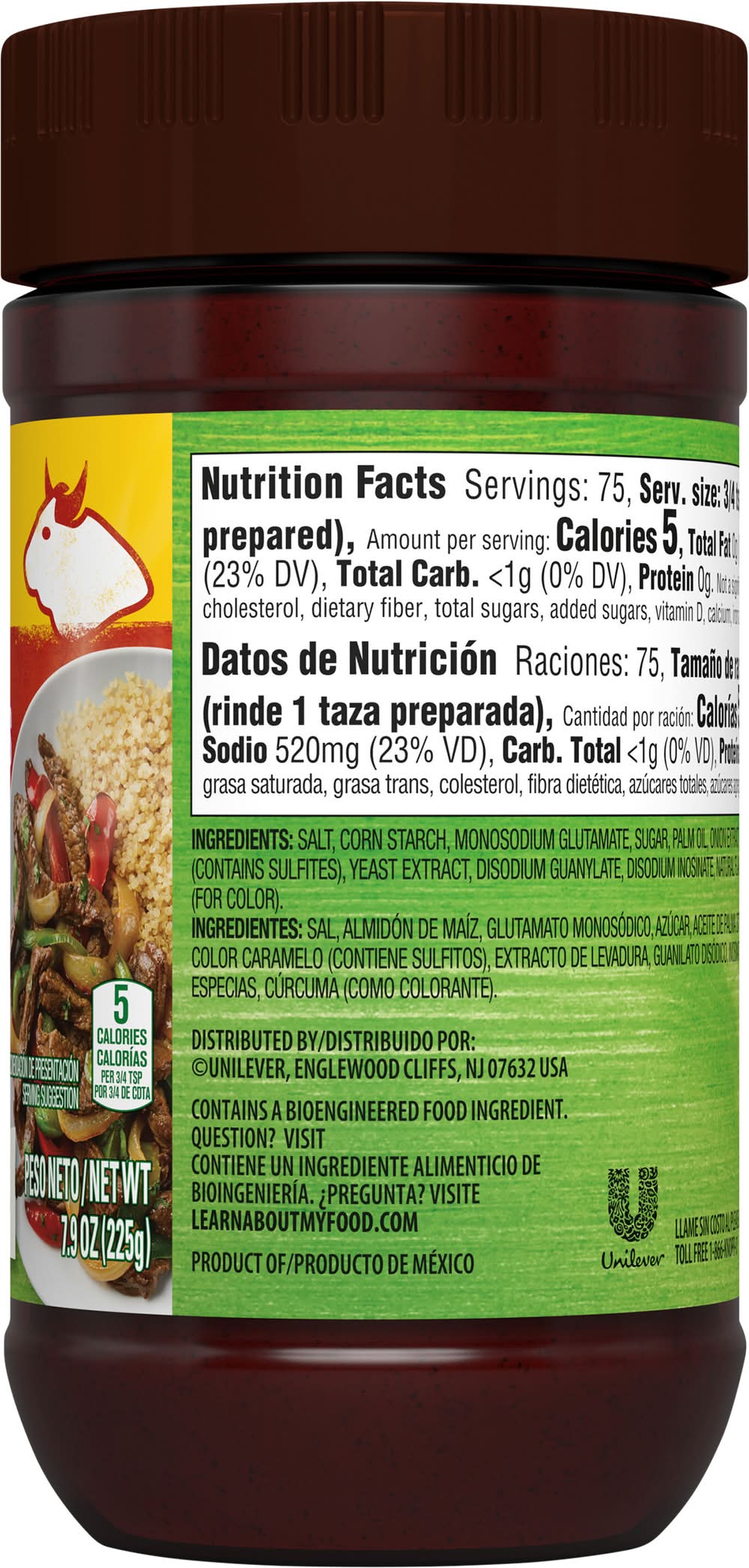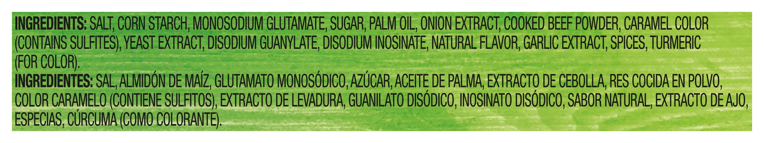 Ingredients: Salt, Corn Starch, Monosodium Glutamate, Sugar, Palm Oil, Onion Extract, Cooked Beef Powder, Caramel Color (Contains Sulfites), Yeast Extract, Disodium Guanylate, Disodium Inosinate, Natural Flavor, Garlic Extract, Spices, Turmeric (for Color)