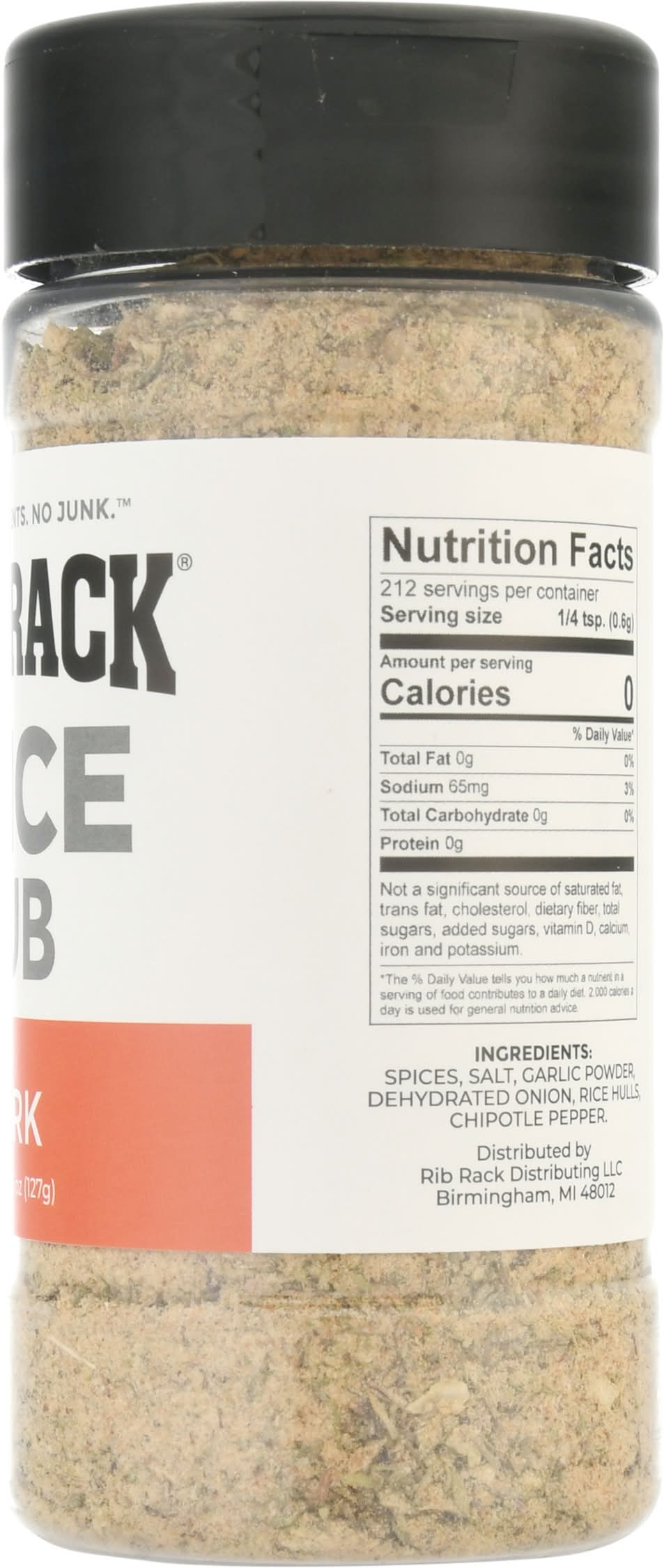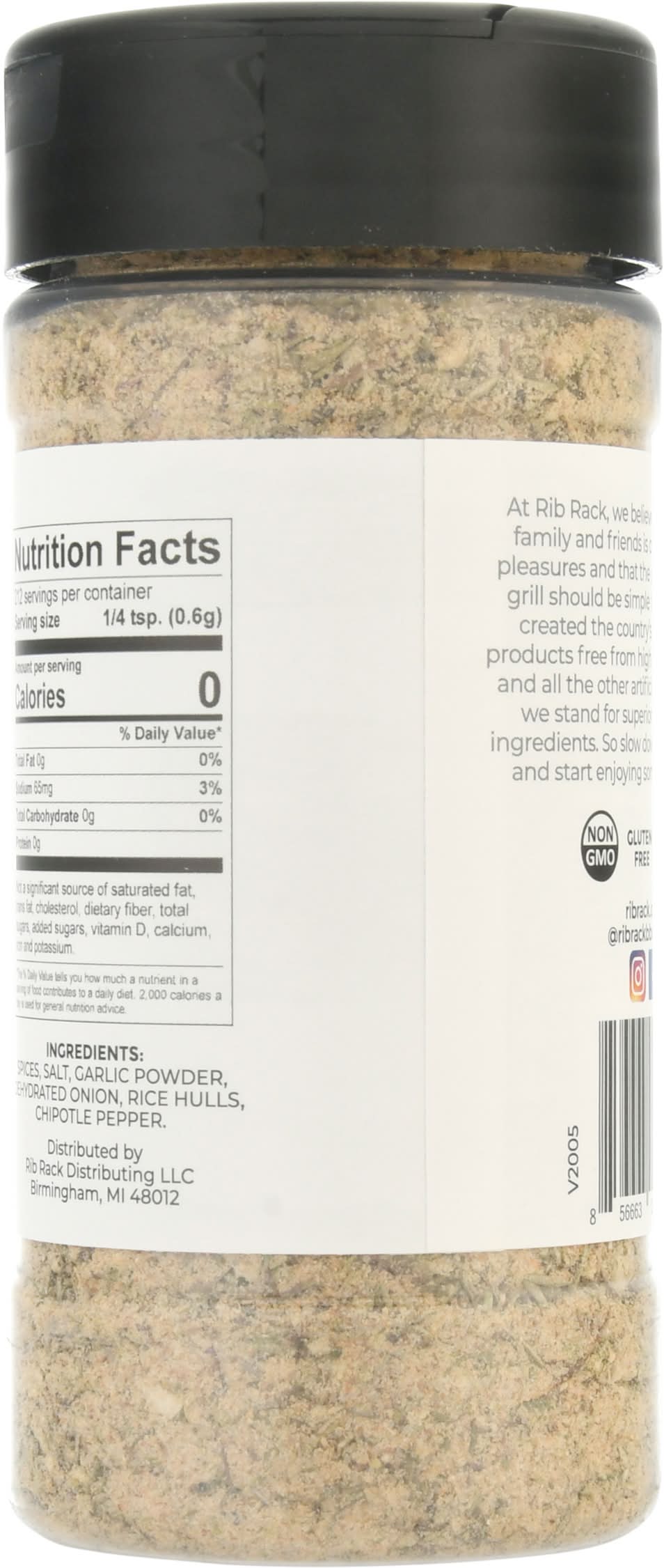 Ingredients: Spices, Salt, Garlic Powder, Dehydrated Onion, Rice Hulls, Chipotle Pepper