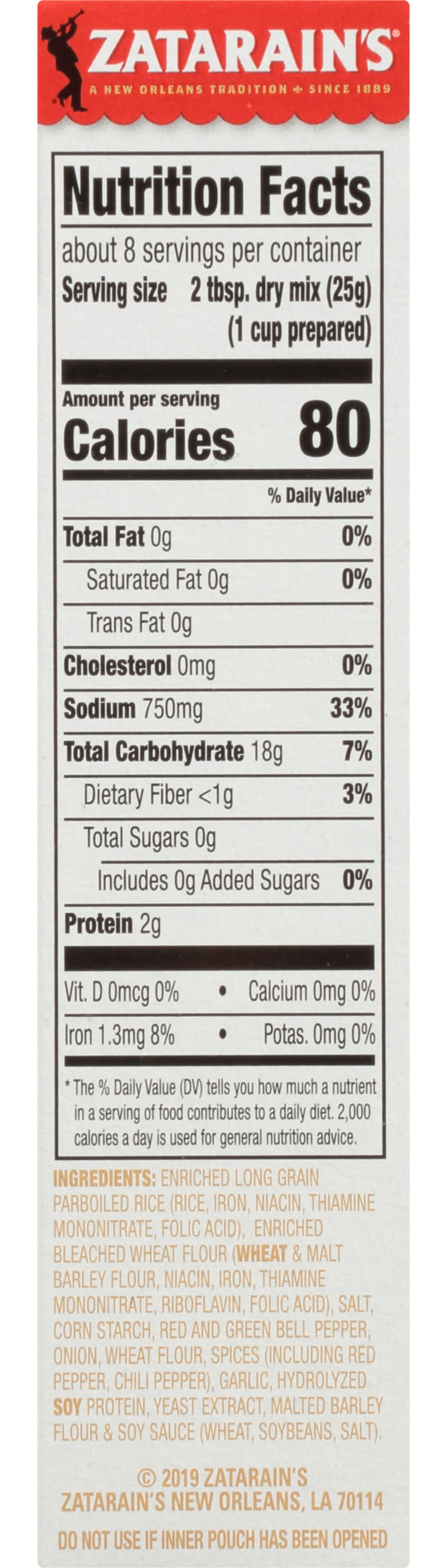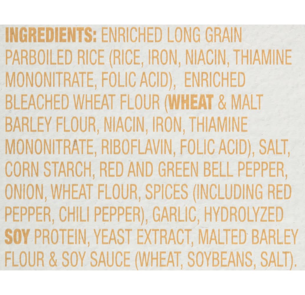 Ingredients: Enriched Long Grain Parboiled Rice (Rice, Iron, Niacin, Thiamine Mononitrate, Folic Acid), Enriched Bleached Wheat Flour (Wheat Malt Barley Flour, Niacin, Iron, Thiamine Mononitrate, Riboflavin, Folic Acid), Salt, Corn Starch, Red and Green Bell Pepper, Onion, Wheat Flour, Spices (Including Red Pepper, Chili Pepper), Garlic, Hydrolyzed Soy Protein, Yeast Extract, Malted Barley Flour Soy Sauce (Wheat, Soybeans, Salt). Contains: wheat, soy
