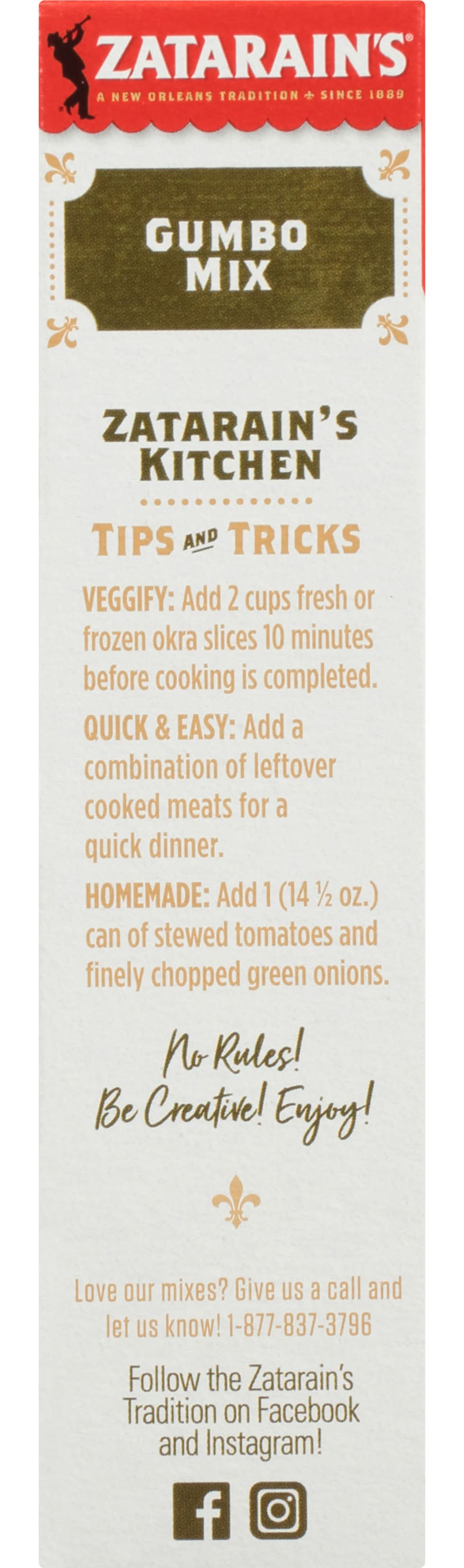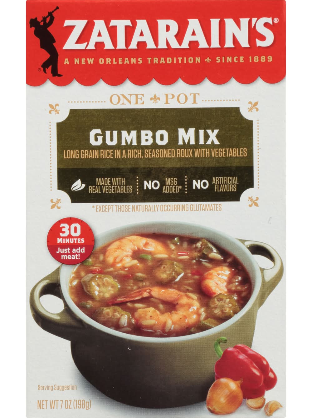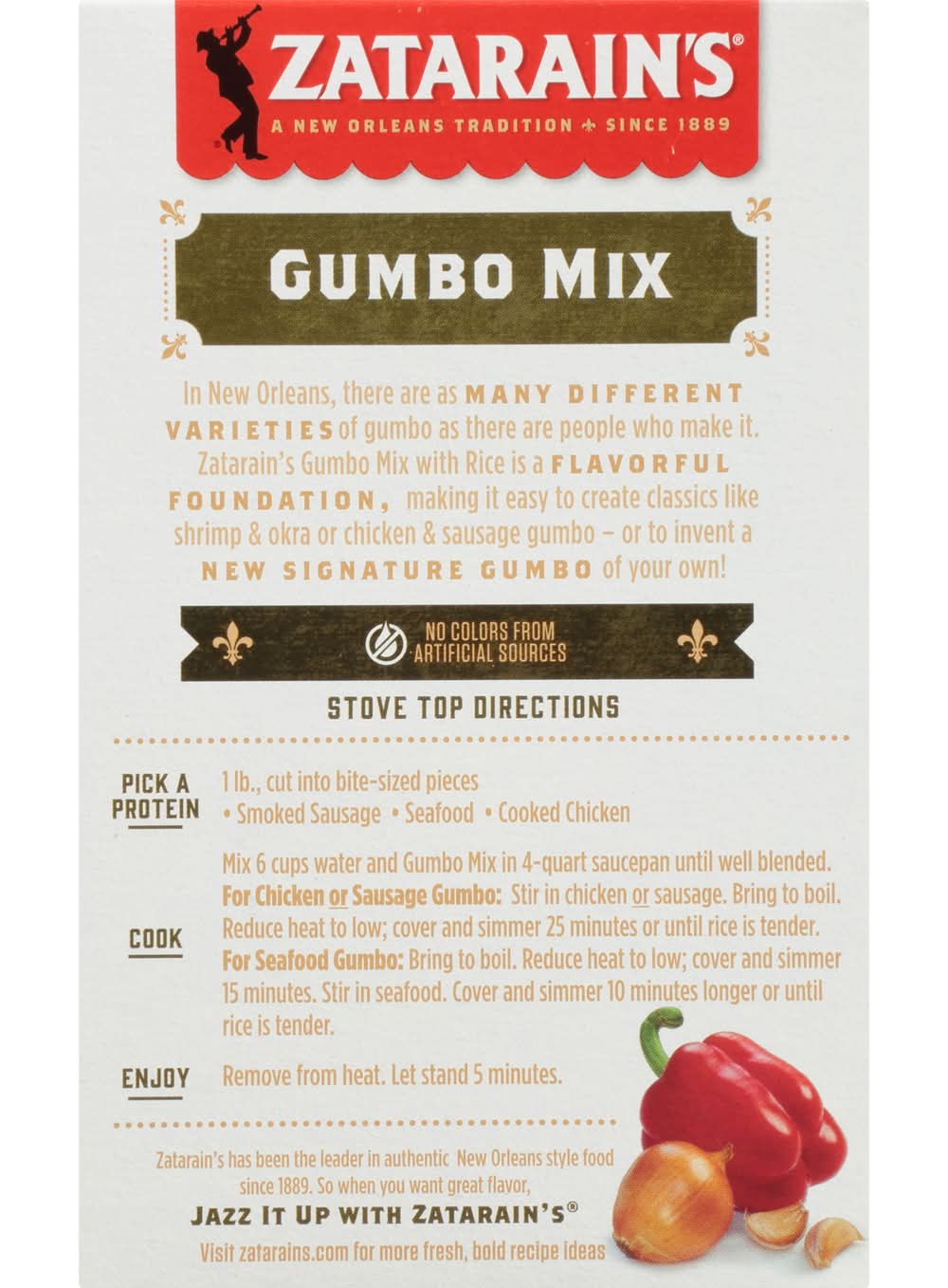 Zatarain's Gumbo Mix is a flavorful foundation of long grain rice in a rich, seasoned roux with red and green bell peppers. Just add one pound of cooked chicken, smoked sausage or seafood, cut into bite size pieces and dinner is ready in just 30 minutes. Zatarain's, New Orleans, LA, 70114