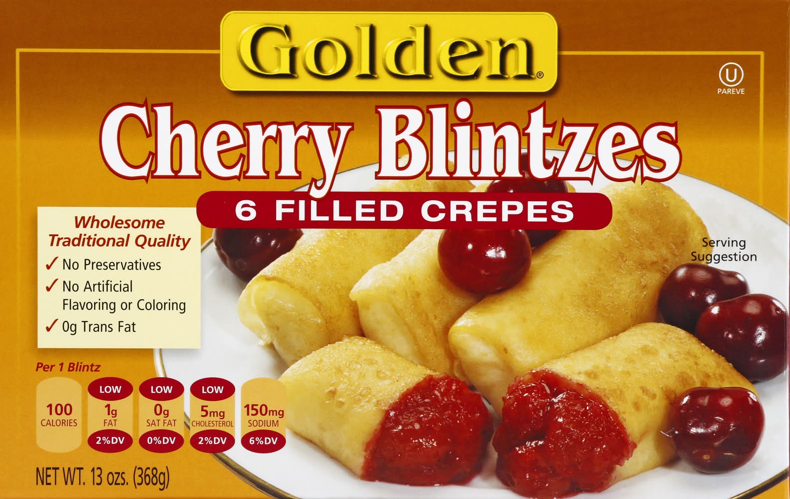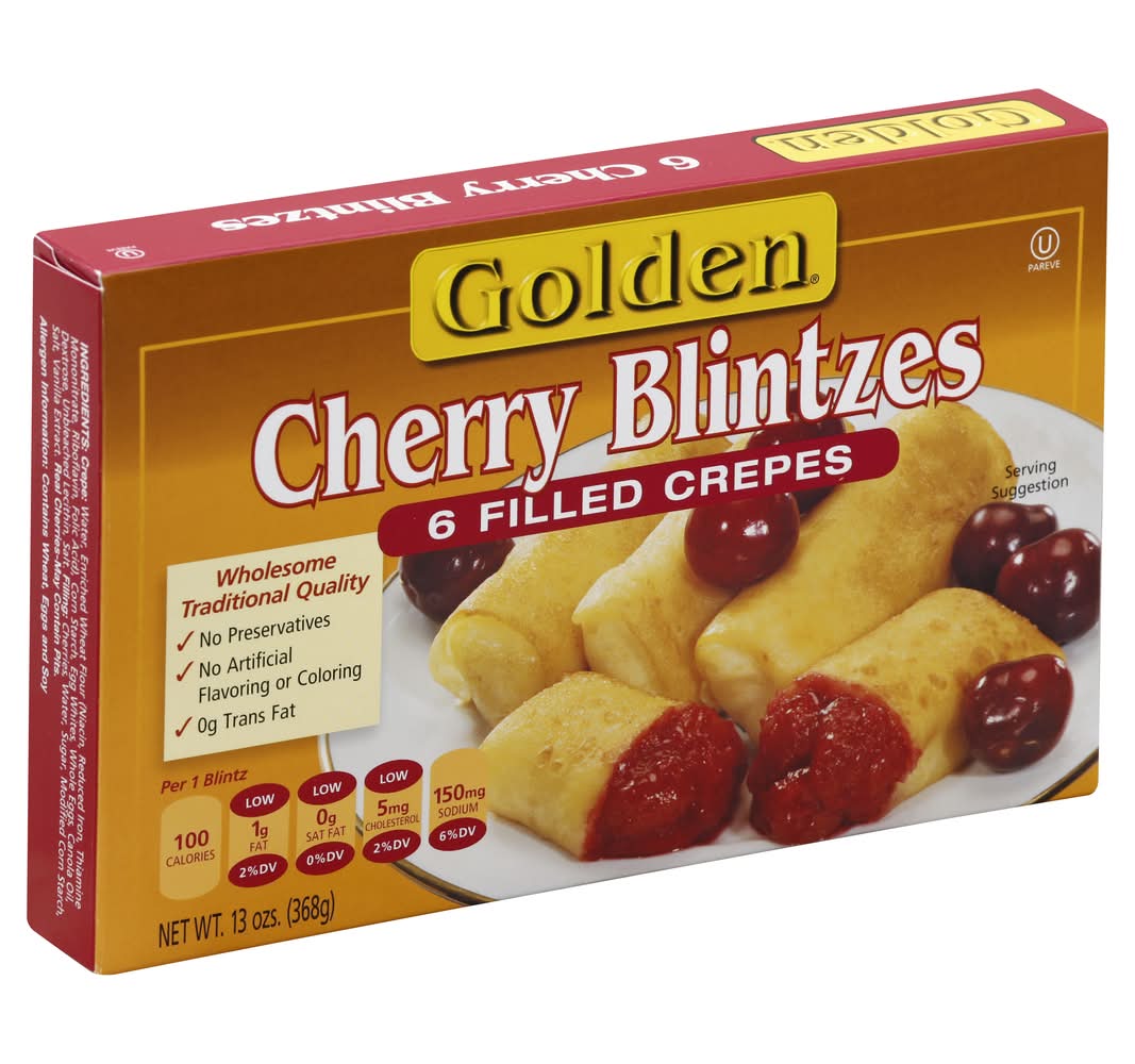 Filled crepes. Wholesome Traditional Quality: No preservatives; No artificial flavoring or colorings; 0 g trans fat. Per 1 Blintz: low 1 g fat (2% DV); low 0 g sat fat (0% DV); low 5 mg cholesterol (2% DV); 150 mg sodium (6% DV). From Our Kitchen to Yours: Generations have grown up enjoying Golden products. Since 1951, we have proudly been making delicious blintzes using wholesome, healthy ingredients; without preservatives, artificial flavors or colors. In 20 minutes or less you can conveniently serve these delicious cherry filled crepes at your next simple meal or part of your family's holiday traditions. We are honored to share a place at your table. www.oldfashionedkitchen.com. OLD FASHIONED KITCHEN, 1045 Towbin Avenue Lakewood, NJ 08701