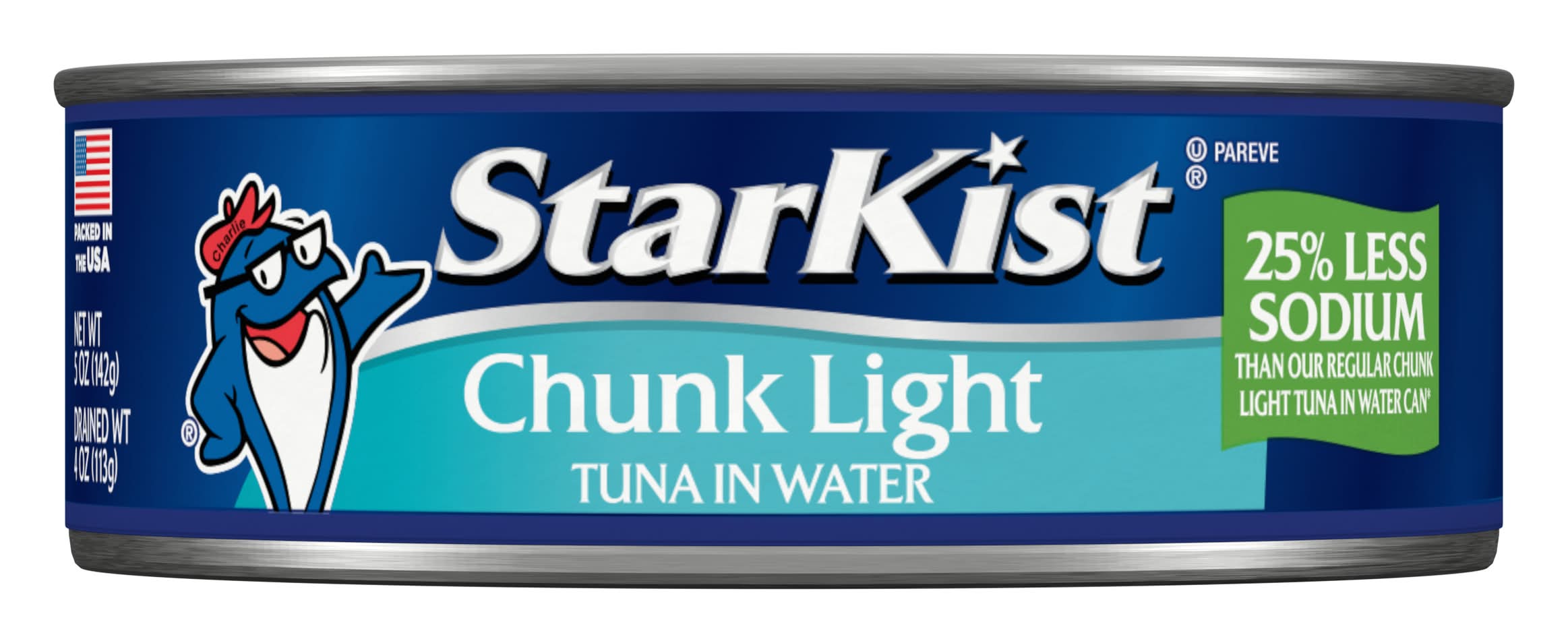 Gluten free. Soy free. 25% less sodium than our regular chunk light tuna in water can ( • Starkist Co., Pittsburgh, PA, 15212 • Packaging: Reusable